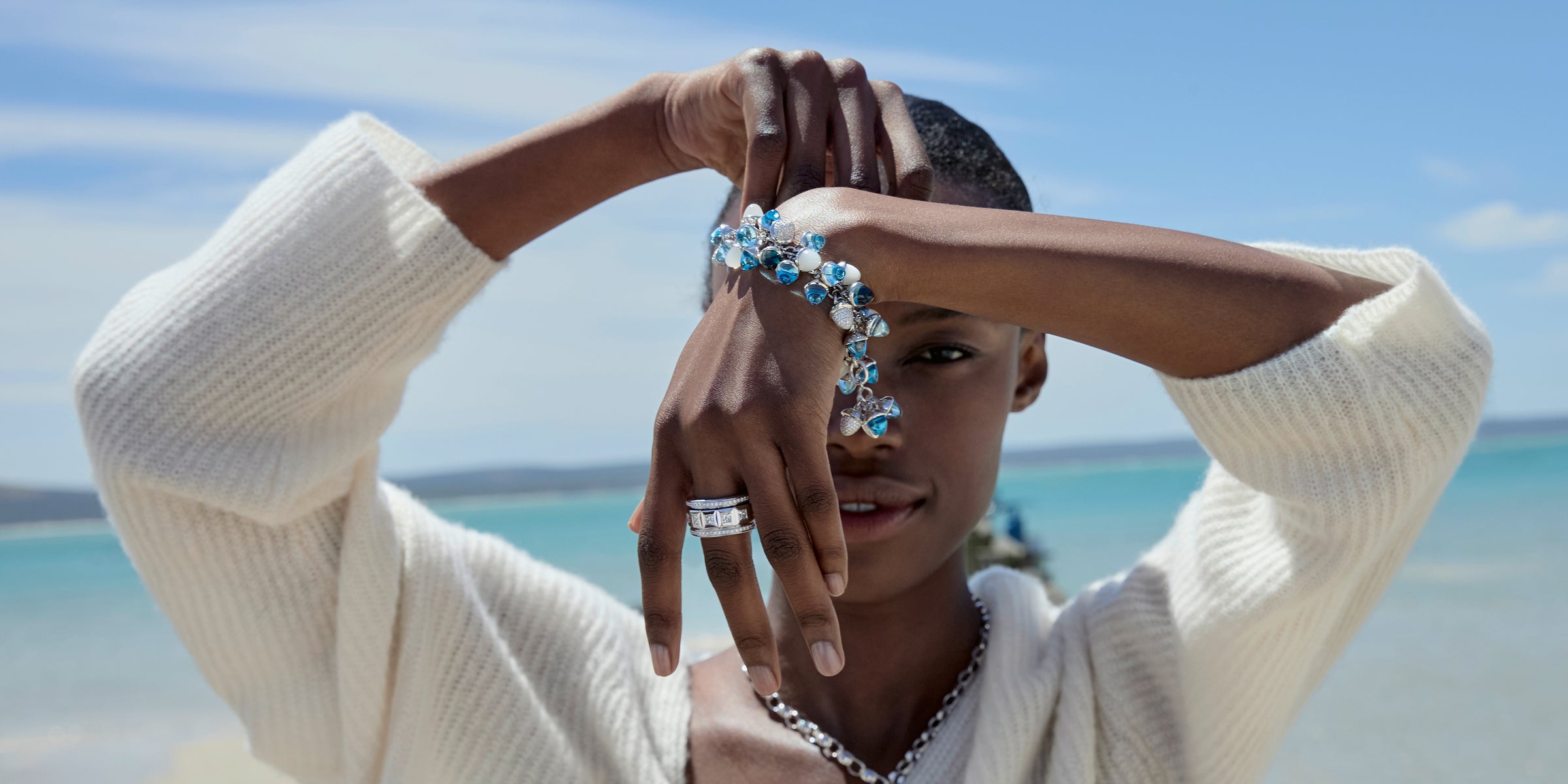 Im Spiel mit kühlen Tönen verzaubert 'Ocean' durch die Kombination von schimmernden Mondsteinen mit einzigartiger Tiefe, funkelnden Diamanten, tiefblauem Topas und 18K Weißgold.