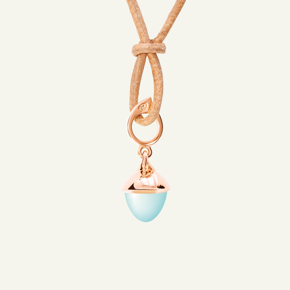 The iconic MIKADO Flamenco Pendant with Aqua Chalcedony features a beautiful blue-green gemstone that gracefully dangles from a delicate water drop charm, all set in 18K gold. Its elegant and timeless design adds a touch of charm to your collection. Ideal for mix & match styling, collecting, and gifting.