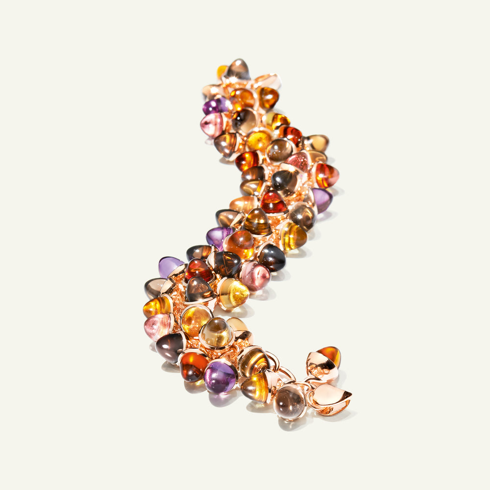 Step into a world of refined warmth with the iconic MIKADO Flamenco Bracelet, featuring 51 acorn-shaped gemstones that capture the passion and energy of Flamenco dance. Handcrafted in 18K gold, the ‘Chestnut’ Color Story plays with the most wonderful colors nature has to offer, where soft brown tones meet vibrant shades of yellow, pink, and violet. A striking design, it evokes the beauty of colorful fall days with timeless sophistication.