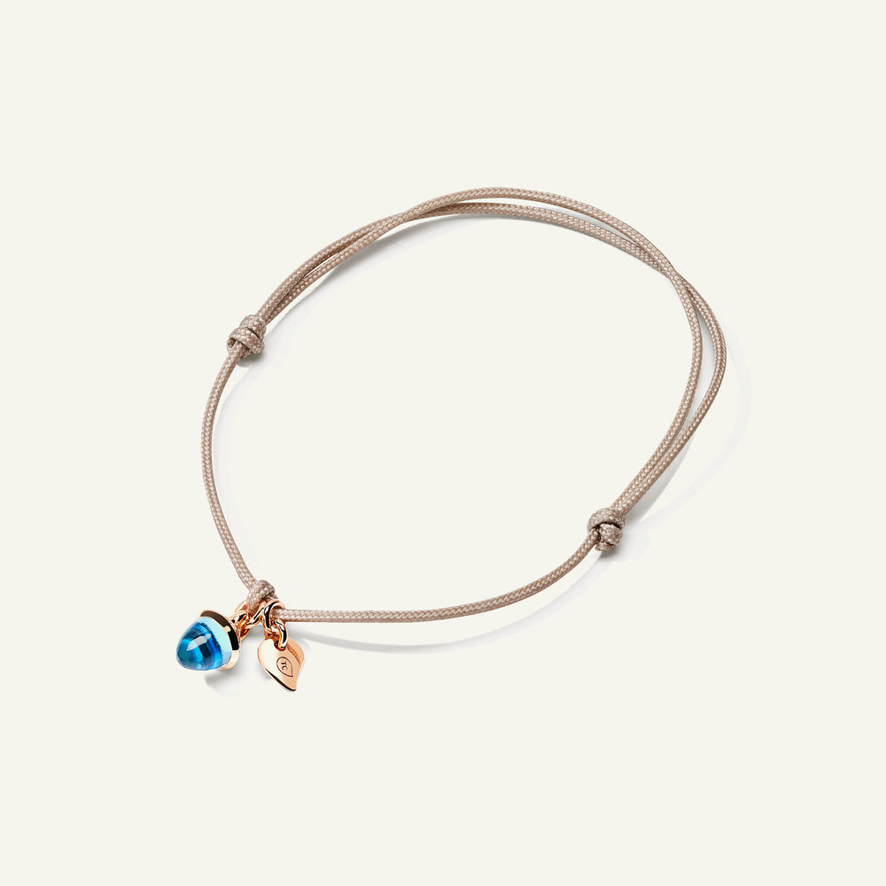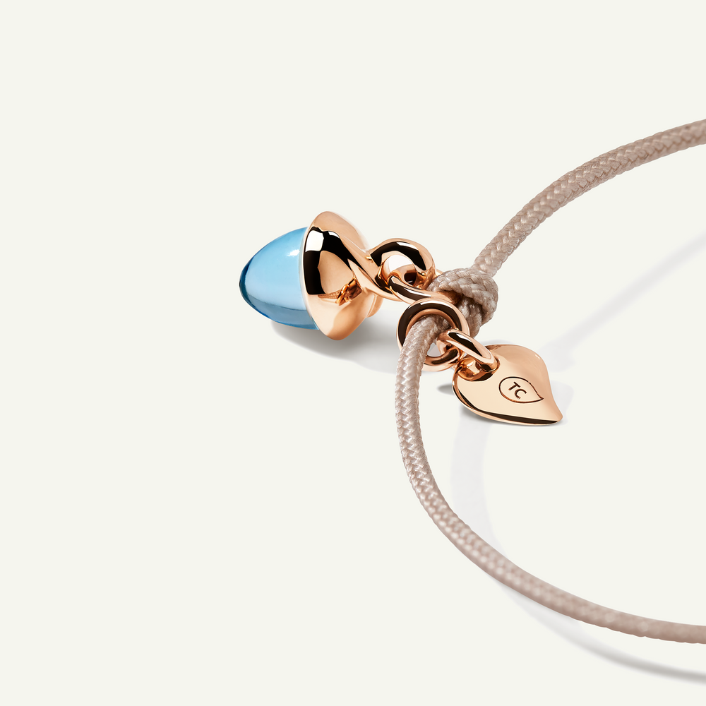 The myMIKADO Bracelet with Swiss Topaz features a petite, light blue acorn-shaped gemstone reminiscent of clear skies, alongside a water drop charm in 18K gold, all set on a durable waterproof nylon cord. Effortless with an understated elegance, it adds a subtle touch of color to everyday looks and makes a thoughtful gift for someone special.