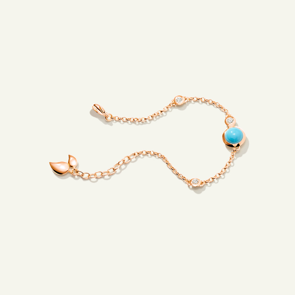 The BOUTON Mini Chain Bracelet with Turquoise highlights the refreshing beauty of vivid cabochon-cut turquoise gemstones paired with delicate water drop details, all set in 18K gold. Eye-catching yet sophisticated, it’s suitable for all wrists and perfect worn alone or layered for a bolder statement. A versatile piece that brings vibrant color and effortless charm to any jewelry collection.