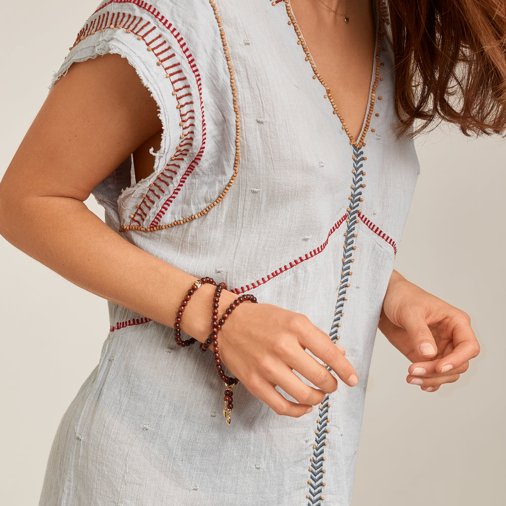 The INDIA Medium Bracelet features polished Snakewood beads, known for their rich, warm tones and distinctive natural patterns, accented with 18K gold beads and the iconic water drop charms. Strung on elastic for a comfortable fit, this versatile design can be wrapped three times as a bracelet or worn long as a necklace, offering timeless style and a striking statement.