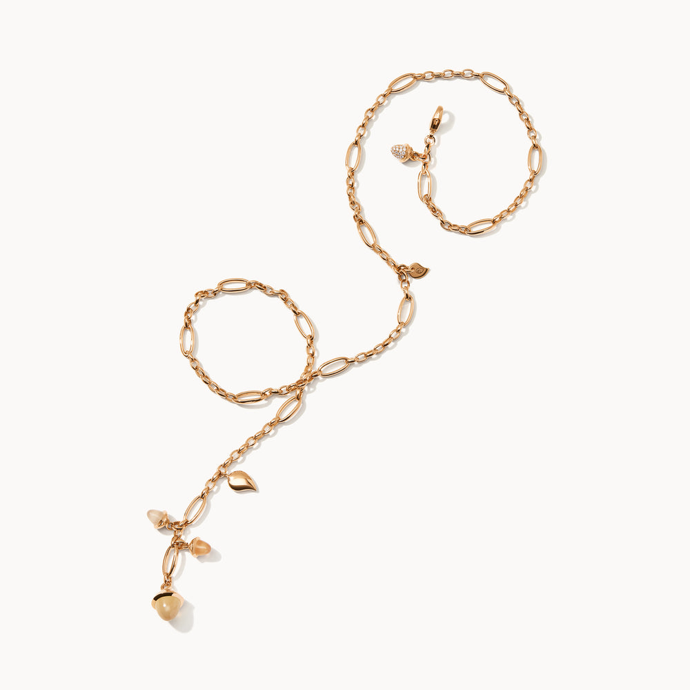 The MIKADO Delicate Necklace in ‘Camel’ features acorn-shaped pendants in warm, earthy tones. Delicate water drop elements and a sparkling Diamond Pavé pendant dance along the handcrafted 18K gold chain. The adjustable length makes it a versatile piece for any occasion.