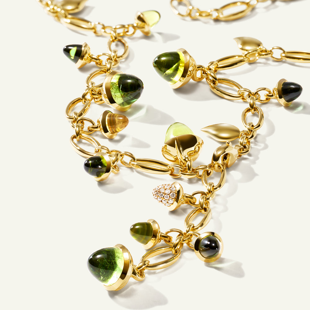 Make a statement with the MIKADO Necklace in ‘Rainforest,’ offering versatile styling options to suit any occasion. A cascade of lush green gemstones shimmers on a handcrafted 18K gold chain. Accented with Diamond Pavé and water drop details for a touch of brilliance. Elegant enough for evening, effortless enough for every day.