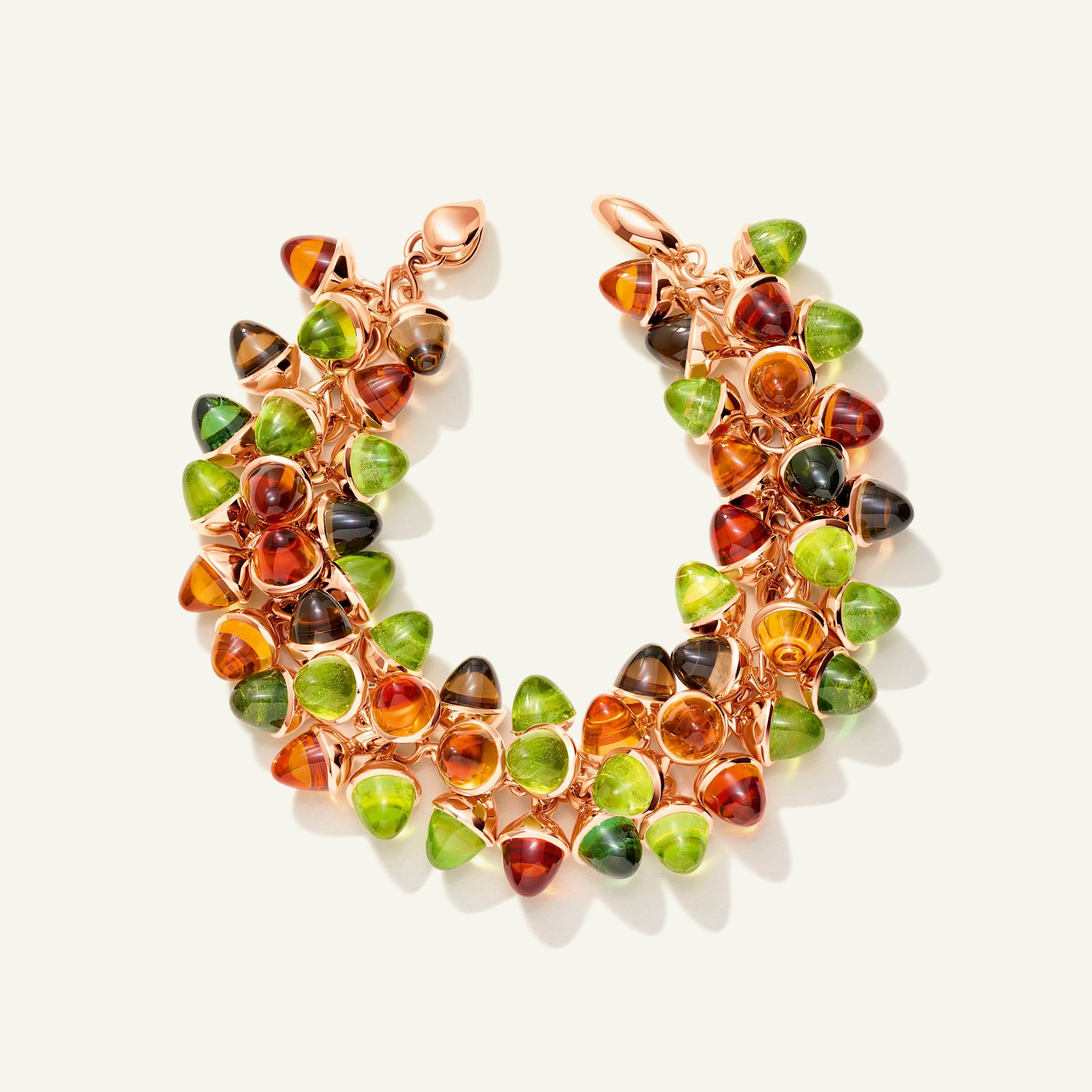 Step into a world of golden warmth with the iconic MIKADO Flamenco Bracelet, featuring 51 acorn-shaped gemstones that capture the passion and energy of Flamenco dance. Handcrafted in 18K gold, the ‘Indian Summer’ Color Story glows with vibrant shades of green, red, and orange, evoking the beauty of late-summer days. A striking design, it brings lively movement and timeless elegance to your style.