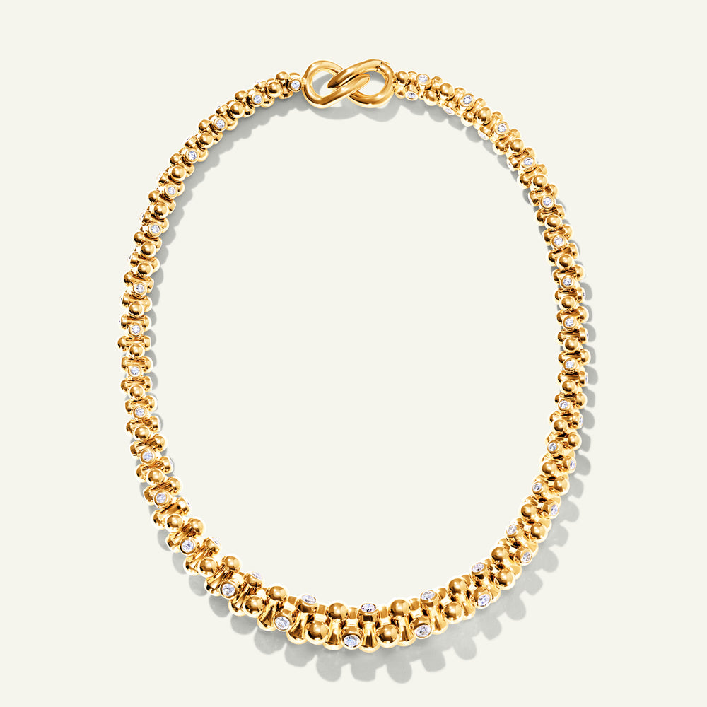 A statement piece to covet, the ALWAYS DIAMONDS Alternating Graduated Necklace in 'Classic' showcases precious diamonds in an alternating pattern set in 18K gold. Its graduated silhouette drapes elegantly along the neckline and boasts a double drop clasp with a beautiful infinity detail. Worn on its own or paired with the ALWAYS DIAMONDS Bracelet, this design embodies timeless luxury.