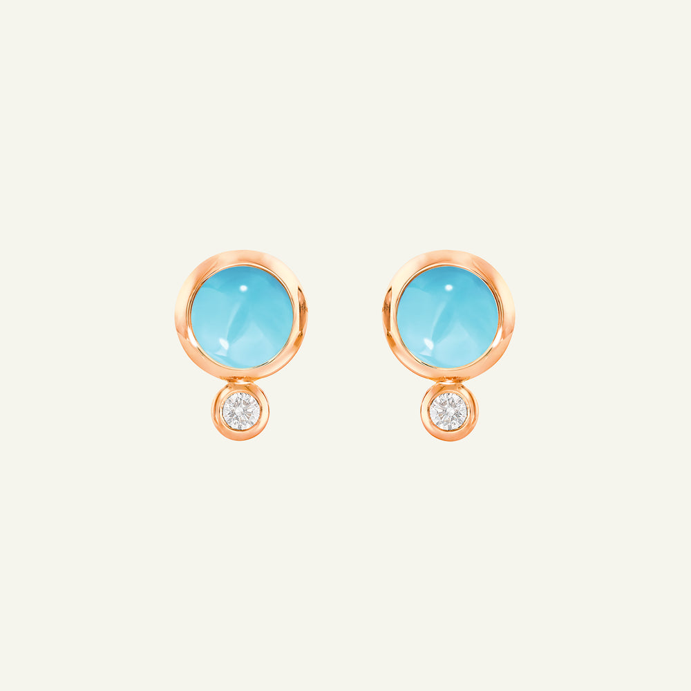 The BOUTON Earrings in 18K gold feature brilliant, blue-green cabochon-cut gemstones paired with a touch of white Diamond sparkle. Designed for versatility, they can be worn with the Diamond dangling downward or positioned up the ear for a different look. A comfortable, classic accessory perfect for everyday wear.