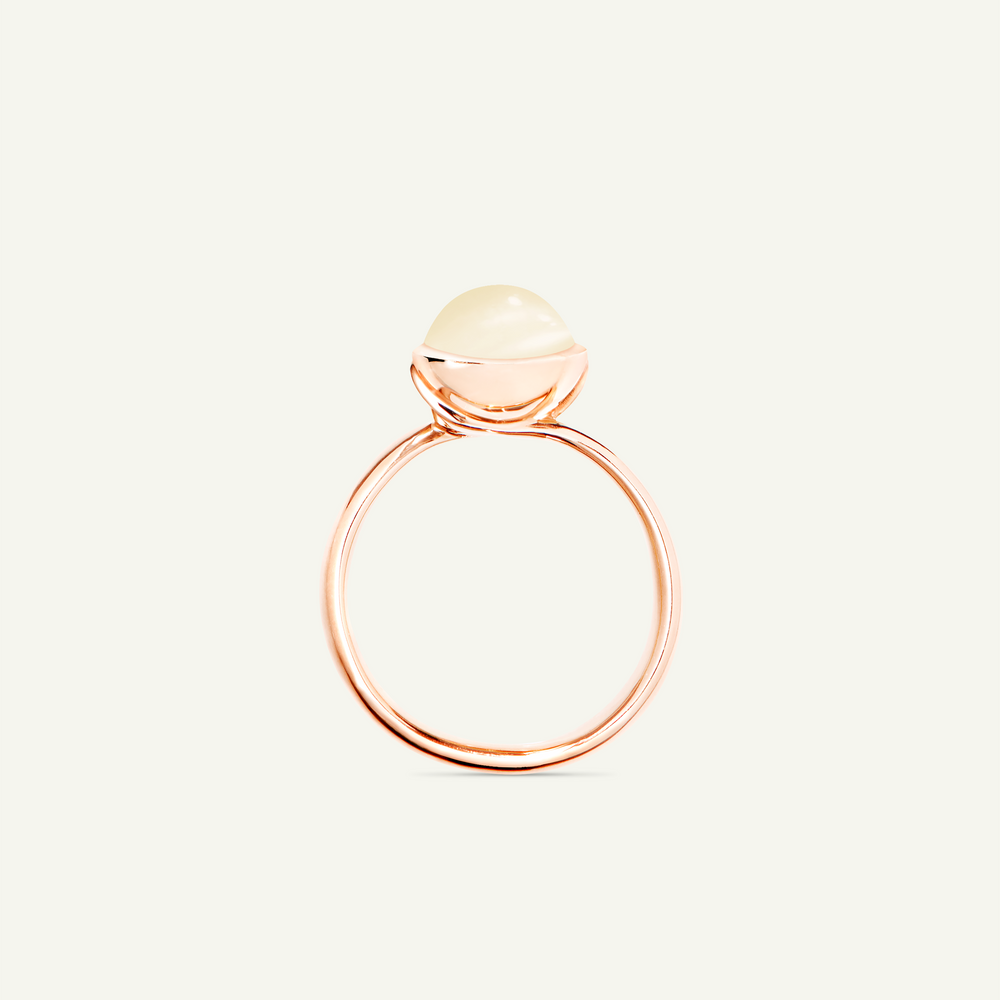 The BOUTON Small Ring in 18K gold features a shimmering, white-toned gemstone, admired for its soft, iridescent glow. Designed with exceptional craftsmanship, it can be worn on its own for an elegant touch or stacked with other BOUTON rings in various sizes for a one-of-a-kind look.