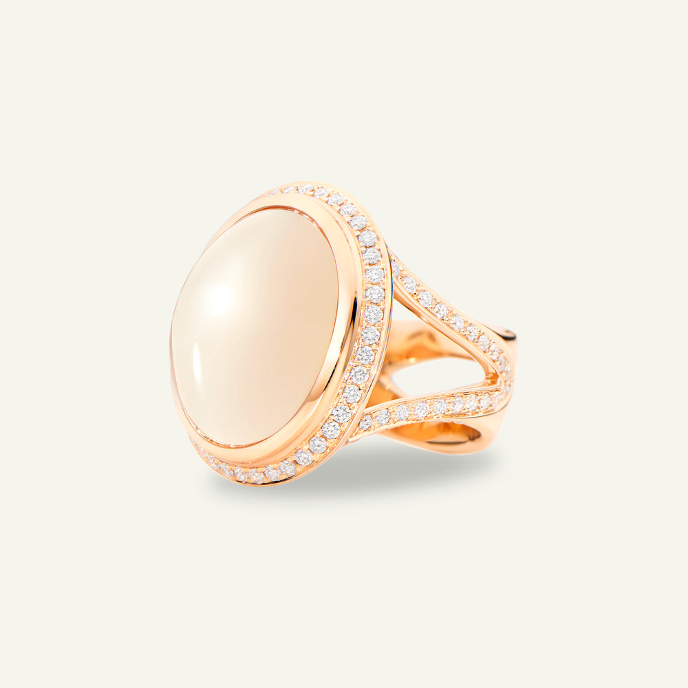 The CUSHION Large Ring showcases a cabochon-cut sand Moonstone with natural iridescence. Diamond Pavé frames this striking cocktail ring in 18K gold. Bold yet timeless, the design embodies effortless elegance and everyday wearability.