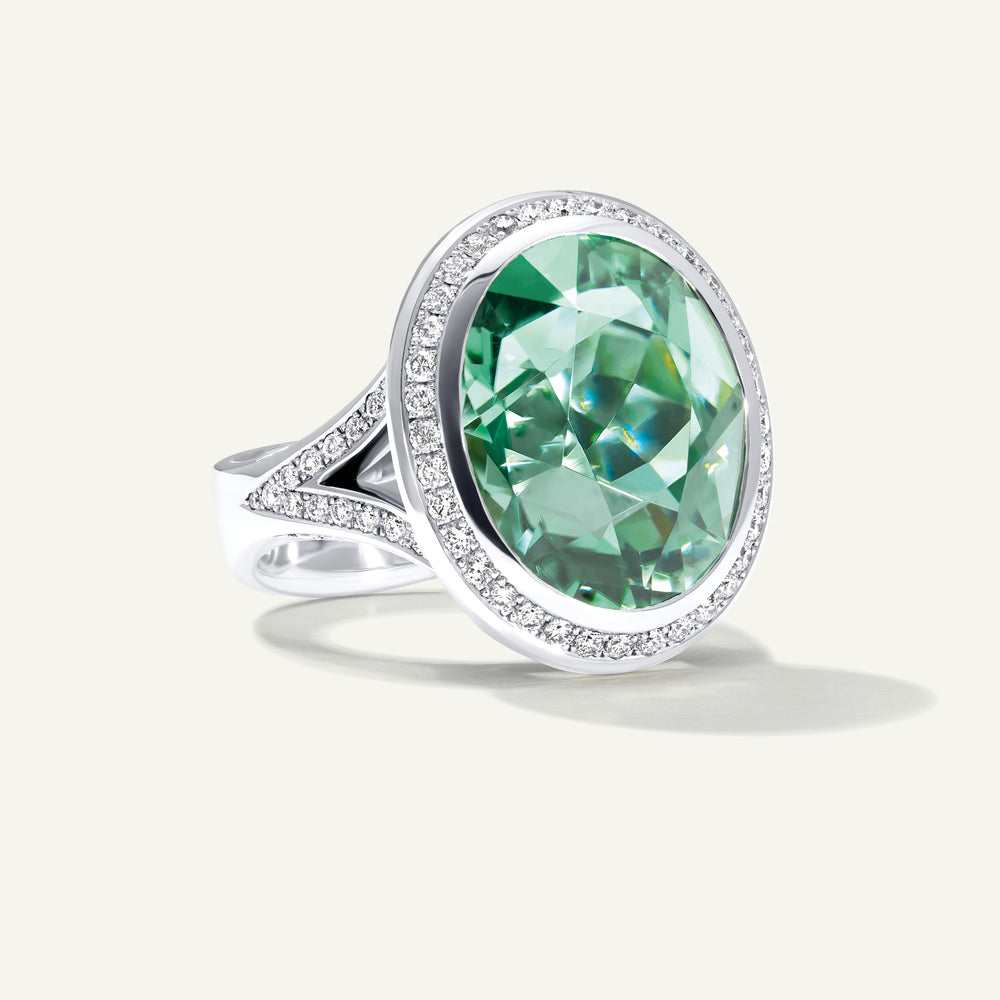 Mit einem 19,15 ct Turmalin im Kissenschliff in gelblich-mintgrüner Farbe sowie ca. 1,87 ct Brillanten-Pavé in feiner Qualität (F/vs).