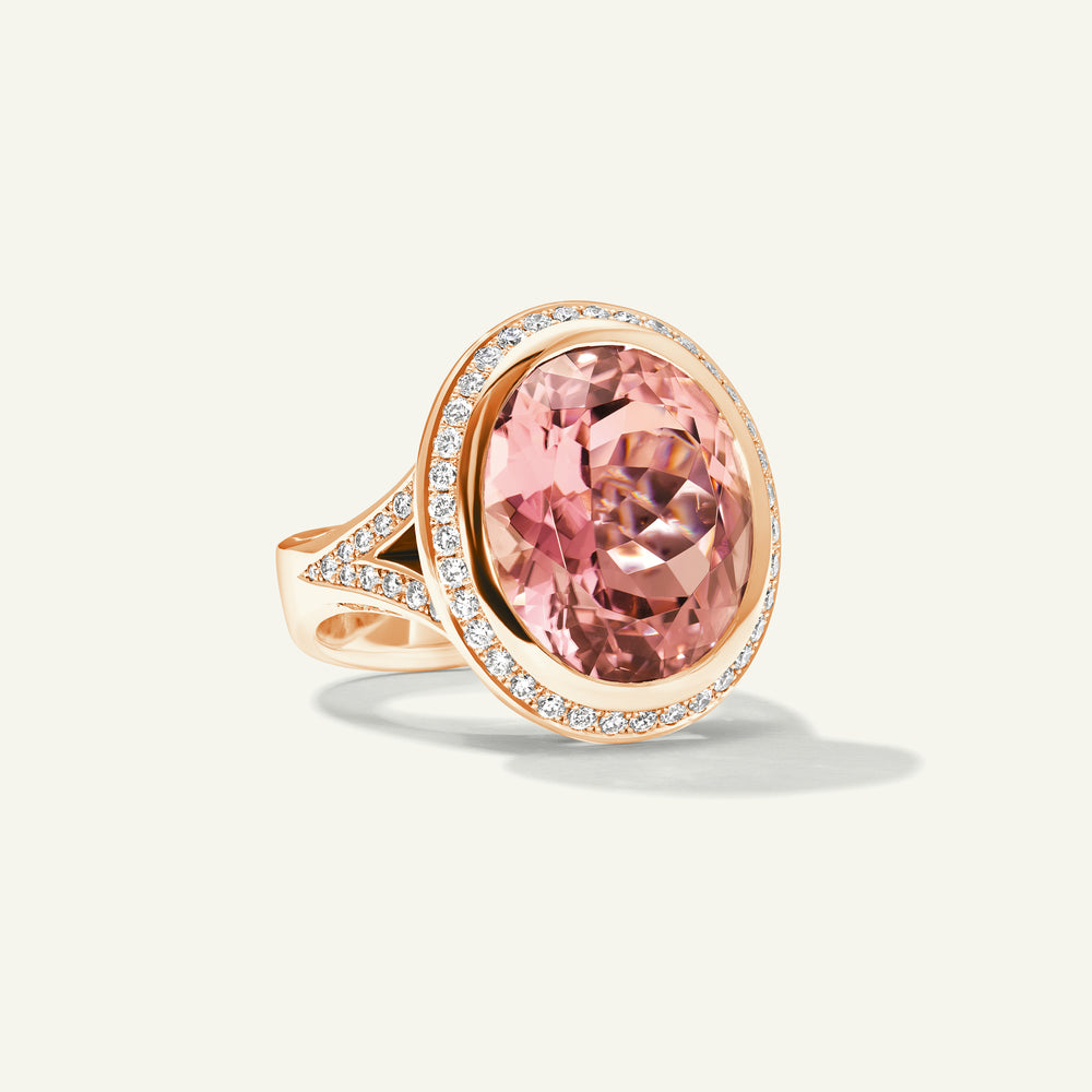 Mit einem 11,12 ct rosa Turmalin im Kissenschliff sowie ca. 1,40 ct Diamant-Pavé in feiner Qualität (F/vs).