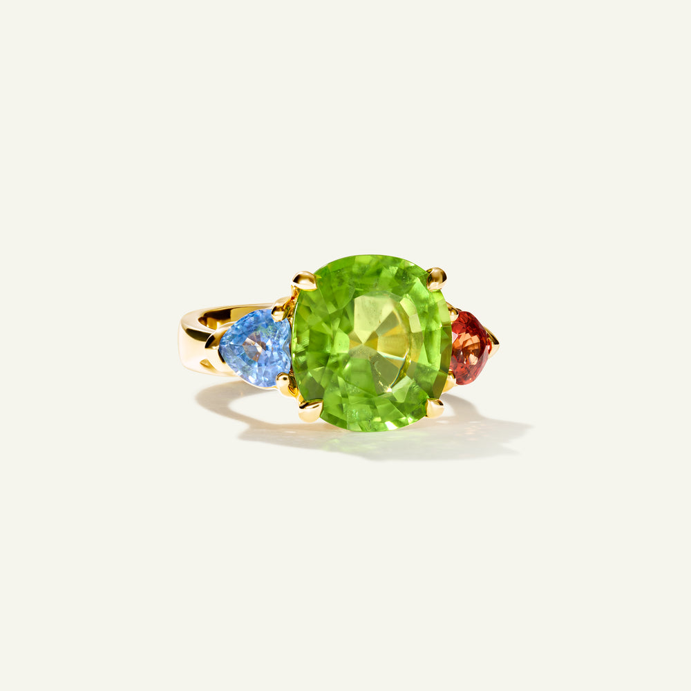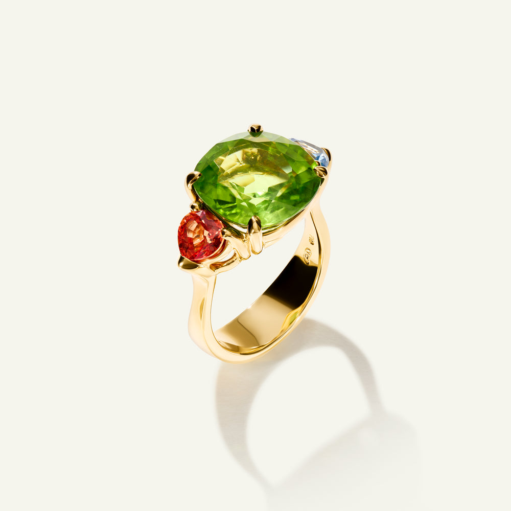Mit einem Peridot in Kissen-Schliff: 7,90 ct und Herz-Schliff Saphiren in blau und orange: 1,70 ct