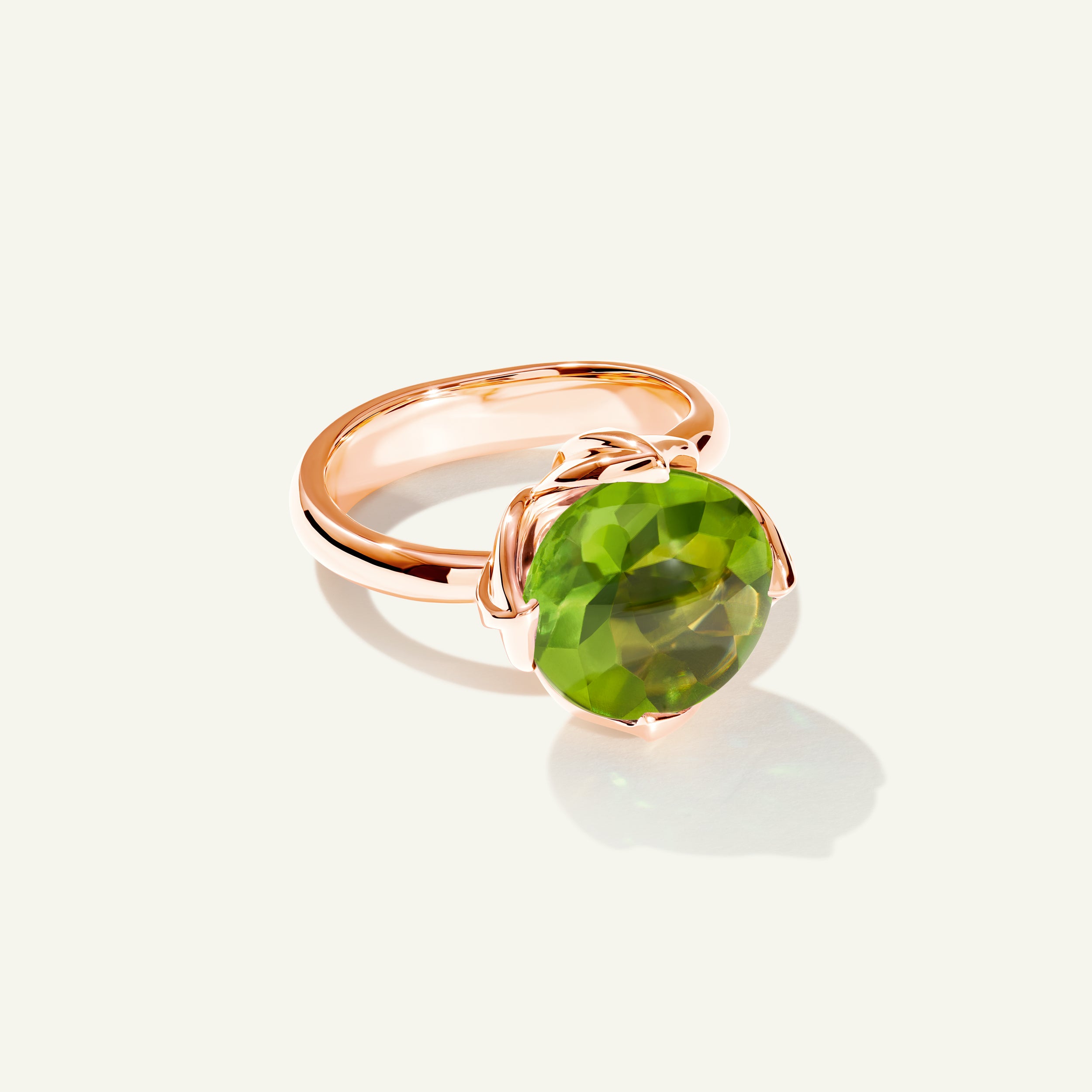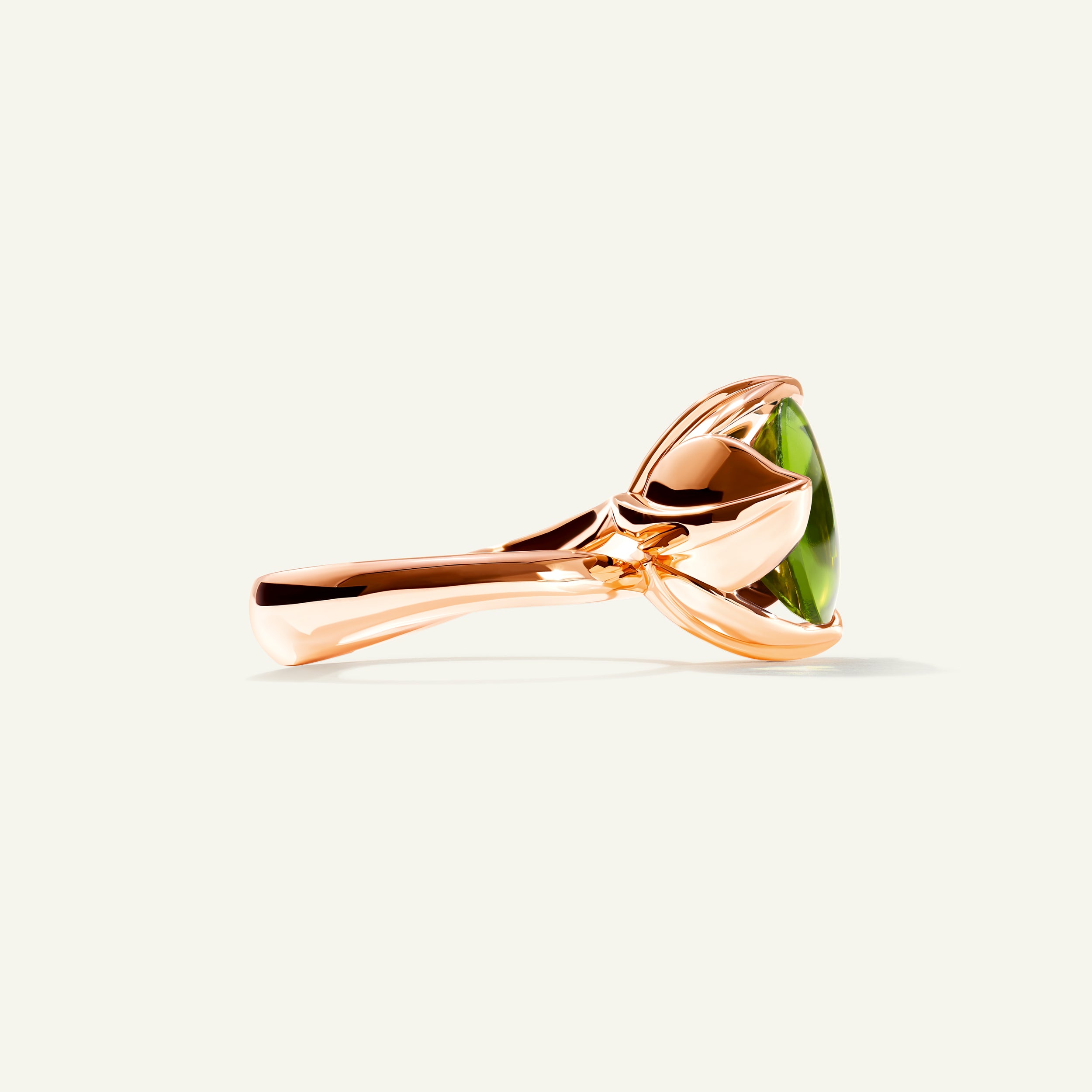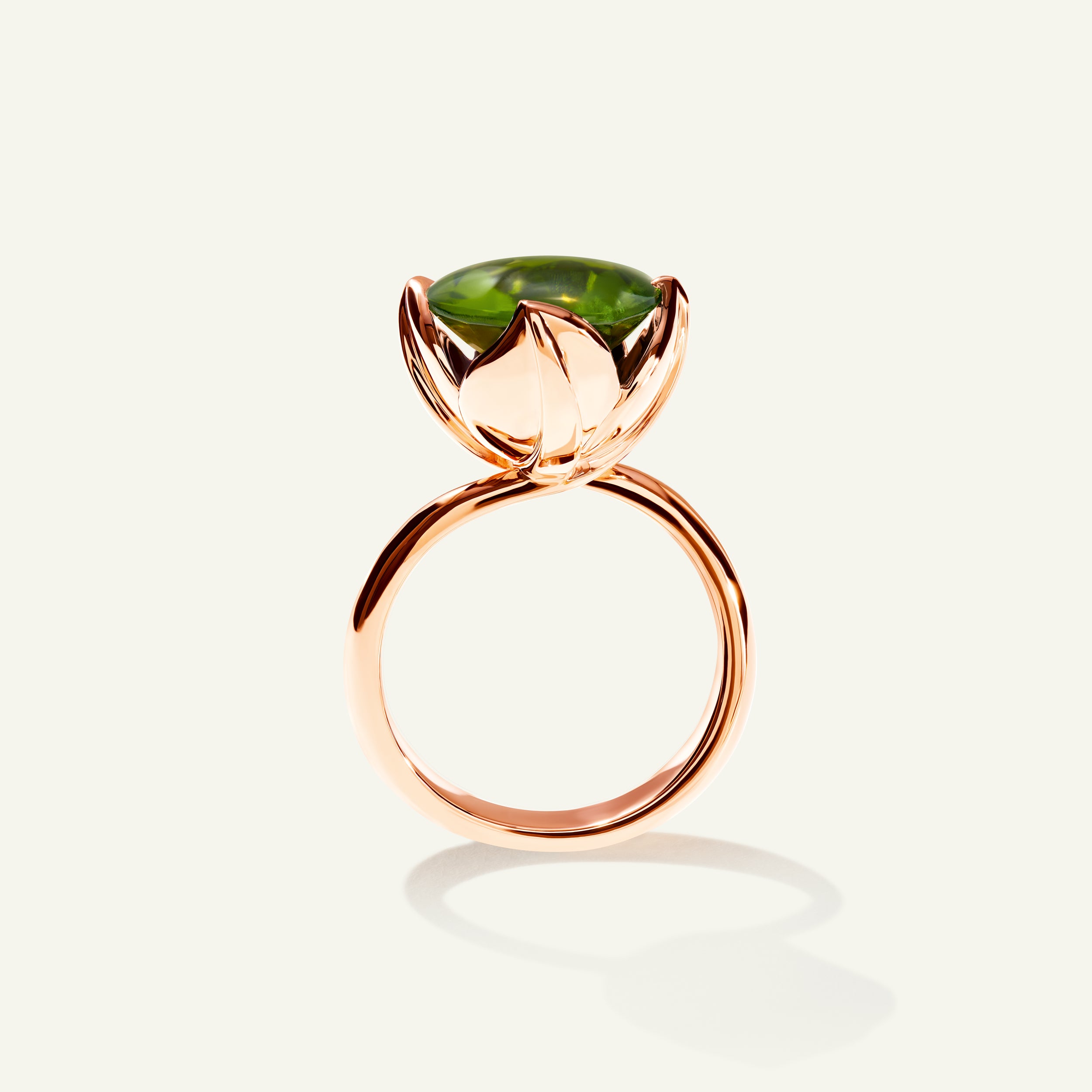 The TULIP Large Ring highlights a bright green Peridot center stone lifted by a delicate prong setting and embraced by four sculpted tulip leaves. The 18K gold band flows gracefully around the finger, designed to be worn alone or paired with other TULIP rings for a signature look.