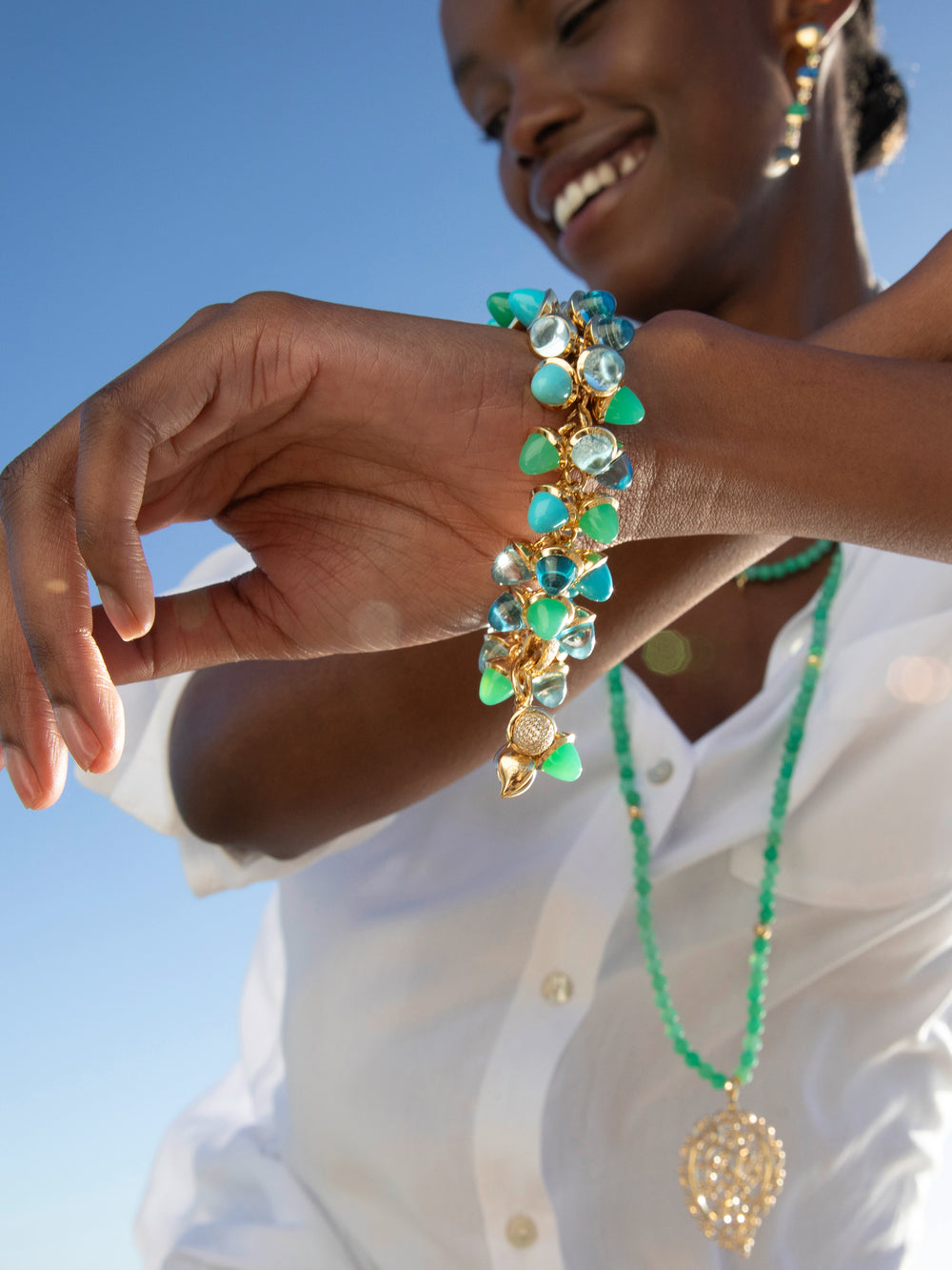 Eine frische Komposition aus schimmerndem Chrysopras, Türkis, Sky Topas und Swiss Topas: Die Color Story 'Lagoon' verleiht Ihrem Alltag die Magie eines entspannten Strandurlaubs.