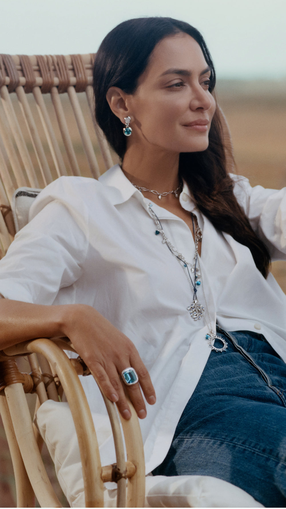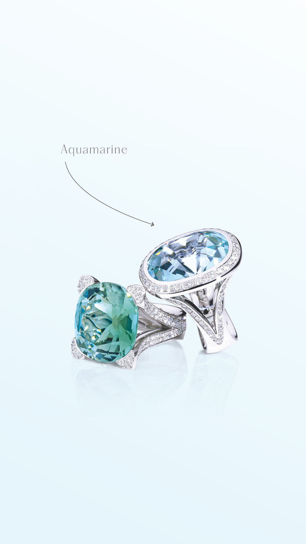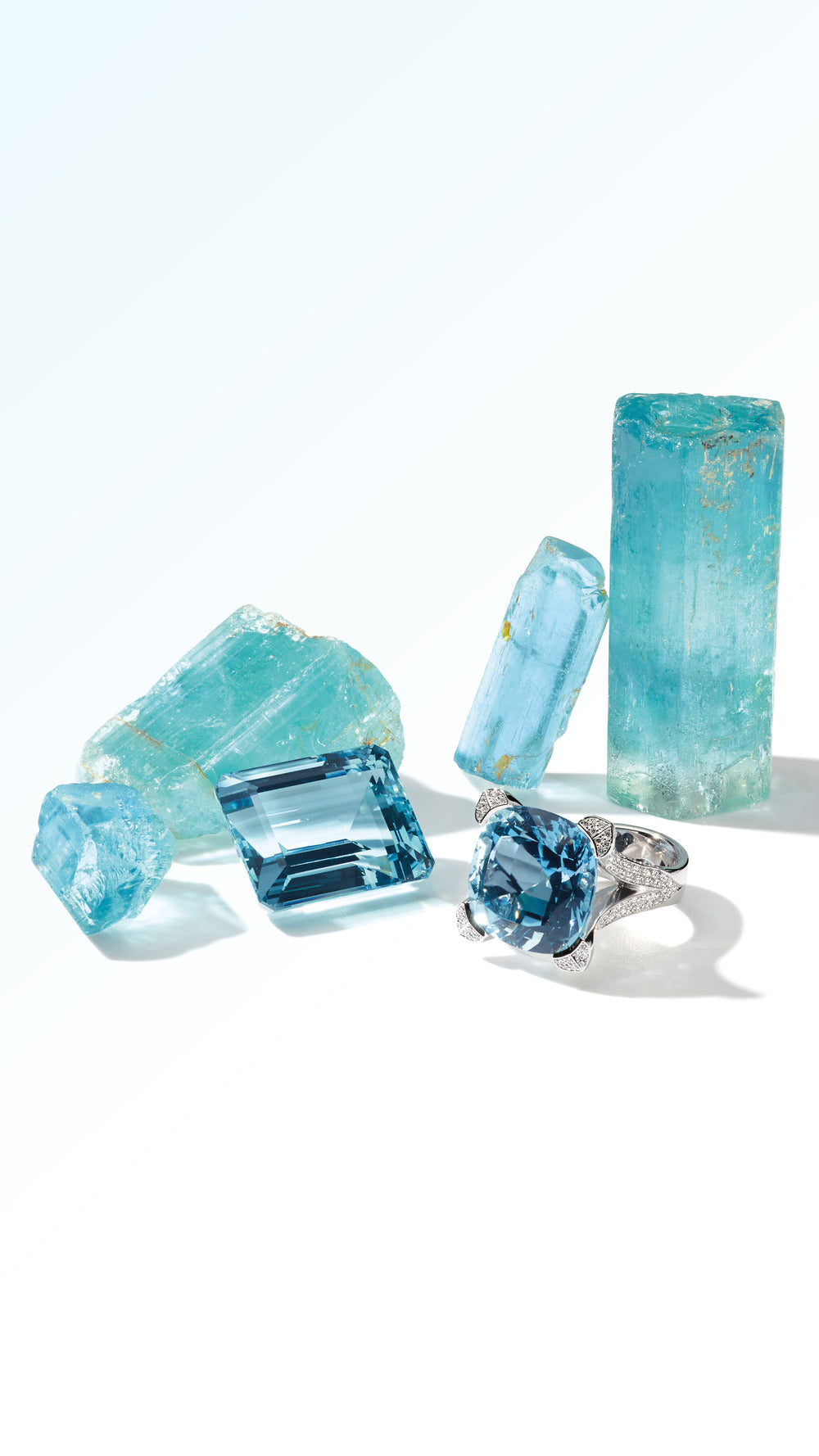Der Name verrät es bereits: Aquamarin leitet sich vom lateinischen aqua (Wasser) und marina (des Meeres) ab. Geschätzt von Königin Elisabeth II., reicht seine Farbpalette von zartem, pudrigem Blau bis hin zu graugrünem Blau. Besonders wertvoll ist der außergewöhnliche Santa-Maria-Aquamarin, der sich durch ein tief gesättigtes Blau auszeichnet.