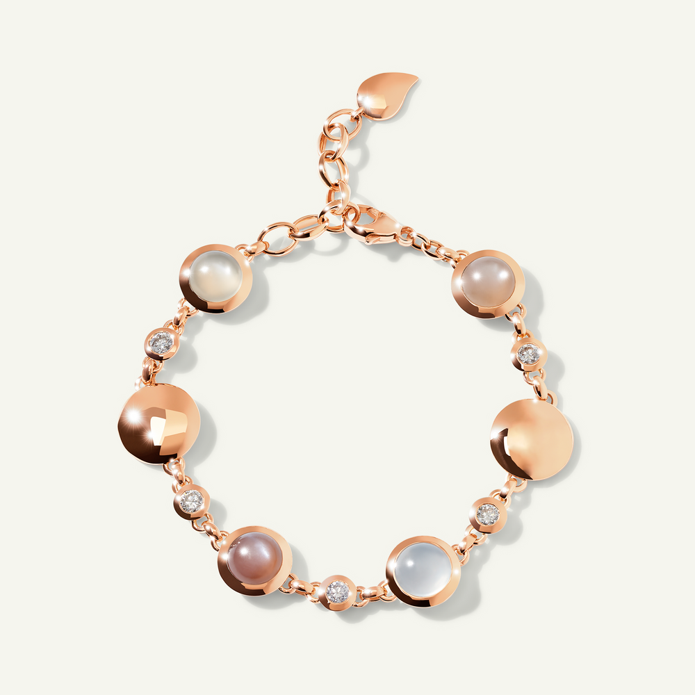 Das BOUTON Armband in 'Camel' ist mit schimmernden, im Cabochon geschliffenen Mondsteinen in warmen, natürlichen Nuancen besetzt und wird von funkelnden weißen Diamanten akzentuiert. Durch sein flexibles Design passt es sich jedem Handgelenk perfekt an und bietet vielseitige Styling-Möglichkeiten. Ein zeitloses Schmuckstück, das Sie viele Jahre lang begleiten wird.