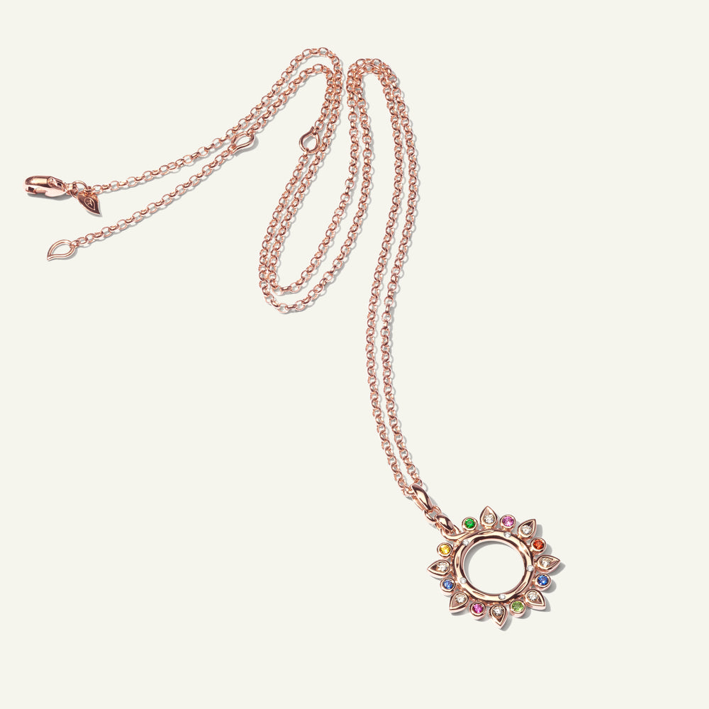 Lebendig und verspielt verkörpert der GYPSY Small Sun Anhänger in der Color Story 'Candy' pure Lebensfreude. Ein funkelnder Regenbogen aus Edelsteinen und schimmernden Diamanten ist kunstvoll in einem strahlenden Sonnenanhänger aus 18 Karat Gold arrangiert, der Wärme, Glück und Positivität symbolisiert. Leicht und voller Energie erstrahlt er mühelos an einem lässigen Lederband oder einer feinen Goldkette.