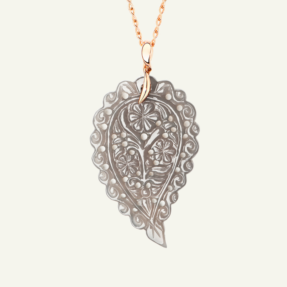 Der INDIA Large Anhänger aus 18 Karat Gold präsentiert kunstvoll geschnitzten grauen Chalcedon, dessen sanfte, durchscheinende Nuancen in einer eleganten Blattform zur Geltung kommen. Für das feine Schwingen an einer Kette entworfen, ist er ein vielseitiger Alltagsfavorit, der jedem Look einen Hauch von Raffinesse verleiht – perfekt, um einem Layering-Style zusätzliche Dimension zu schenken.