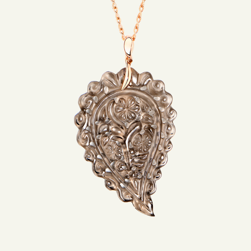 Der INDIA Large Anhänger aus 18 Karat Gold präsentiert kunstvoll geschnitzten Rauchquarz, dessen durchscheinende Grau-Braun-Töne in einer eleganten Blattform zur Geltung kommen. Für das zarte Schwingen an einer Kette entworfen, ist er ein wunderschöner Alltagsfavorit, der jedem Look einen Hauch von Raffinesse verleiht – perfekt, um einem Layering-Style zusätzliche Dimension zu geben.