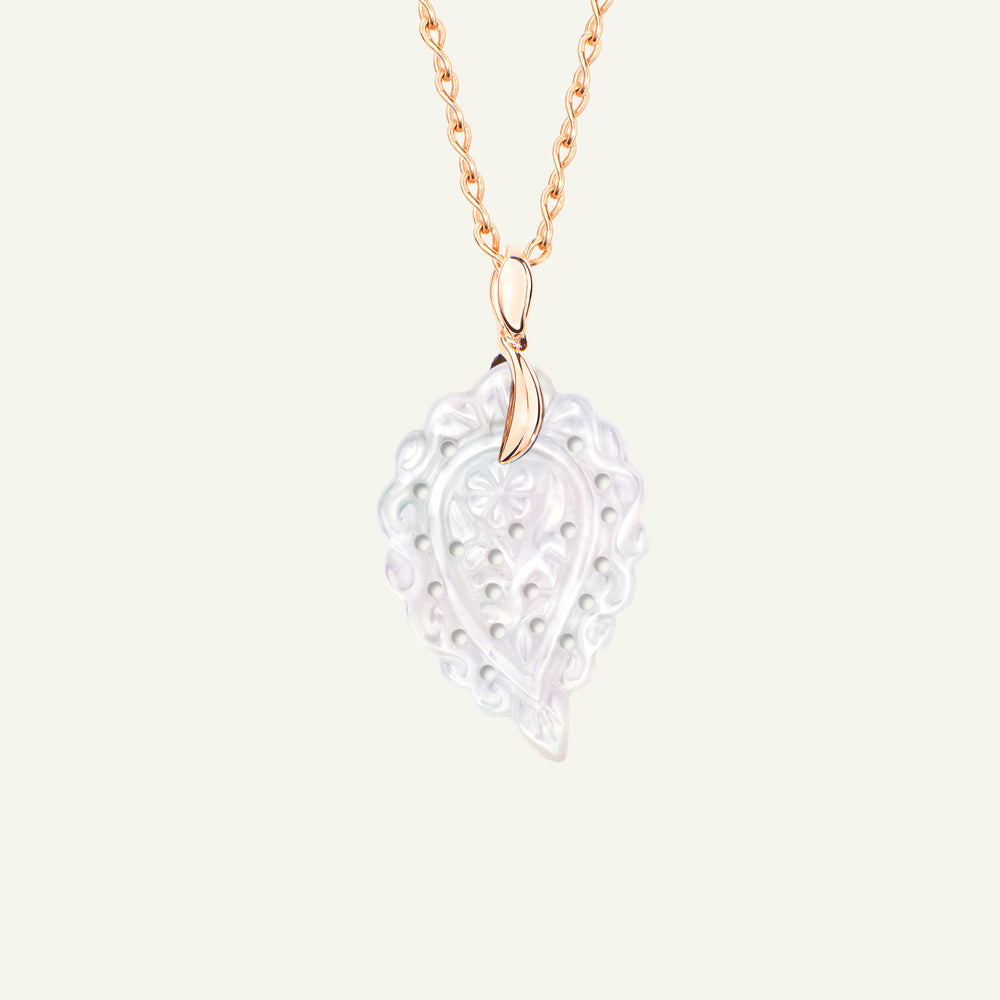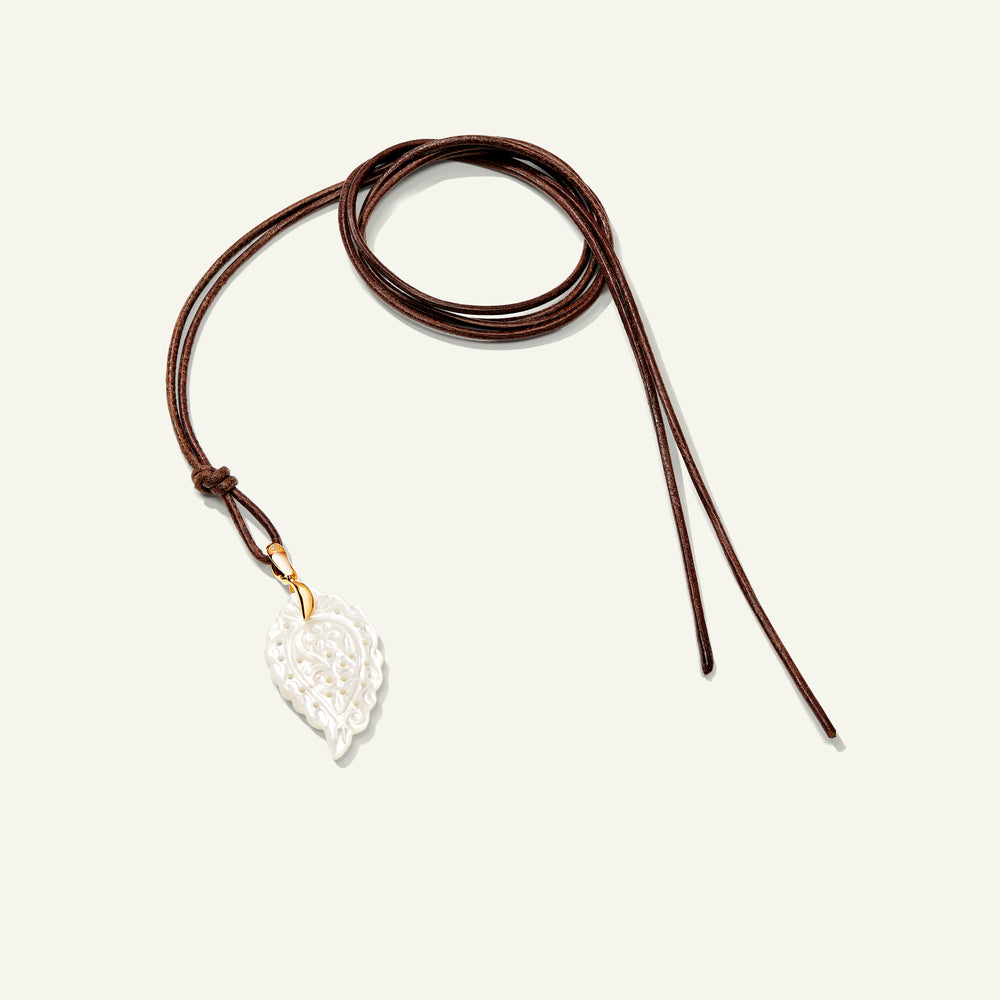 Der INDIA Small Anhänger aus 18 Karat Gold präsentiert kunstvoll geschnitztes Perlmutt, dessen sanfte, irisierende Töne in einer eleganten Blattform zur Geltung kommen. Für das zarte Schwingen an einer Kette entworfen, ist er ein wunderschöner Alltagsfavorit, der jedem Look einen Hauch von Raffinesse verleiht – perfekt, um einem Layering-Style zusätzliche Dimension zu geben.