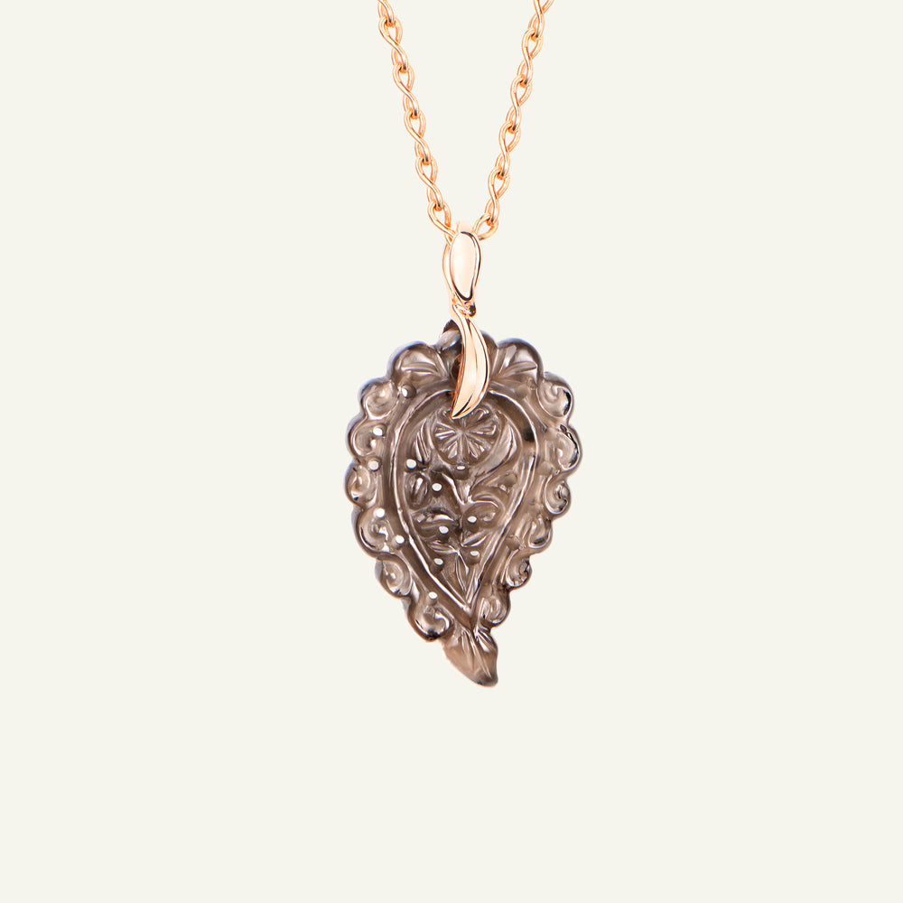 Der INDIA Small Anhänger aus 18 Karat Gold präsentiert kunstvoll geschnitzten Rauchquarz, dessen durchscheinende Grau-Braun-Töne in einer eleganten Blattform zur Geltung kommen. Für das zarte Schwingen an einer Kette entworfen, ist er ein wunderschöner Alltagsfavorit, der jedem Look einen Hauch von Raffinesse verleiht – perfekt, um einem Layering-Style zusätzliche Dimension zu geben.