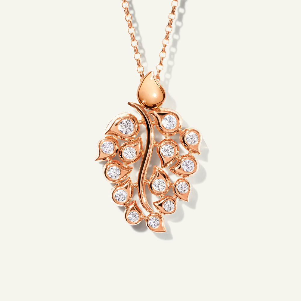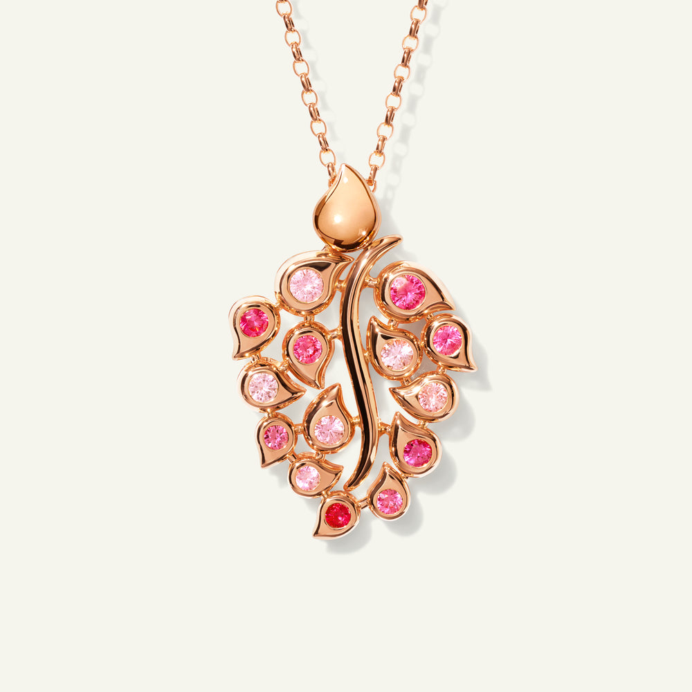 Der SNOWFLAKES Leaf Anhänger in 'Blush' funkelt auf der einen Seite mit pinkfarbenen Saphiren und auf der anderen mit funkelnden weißen Diamanten, jeweils gefasst in 18 Karat Gold. Getragen an einer langen Kette oder einem lässigen Lederband, ist dieser Anhänger vielseitig einsetzbar – eine elegante Wahl für alltäglichen Luxus ebenso wie für besondere Anlässe.