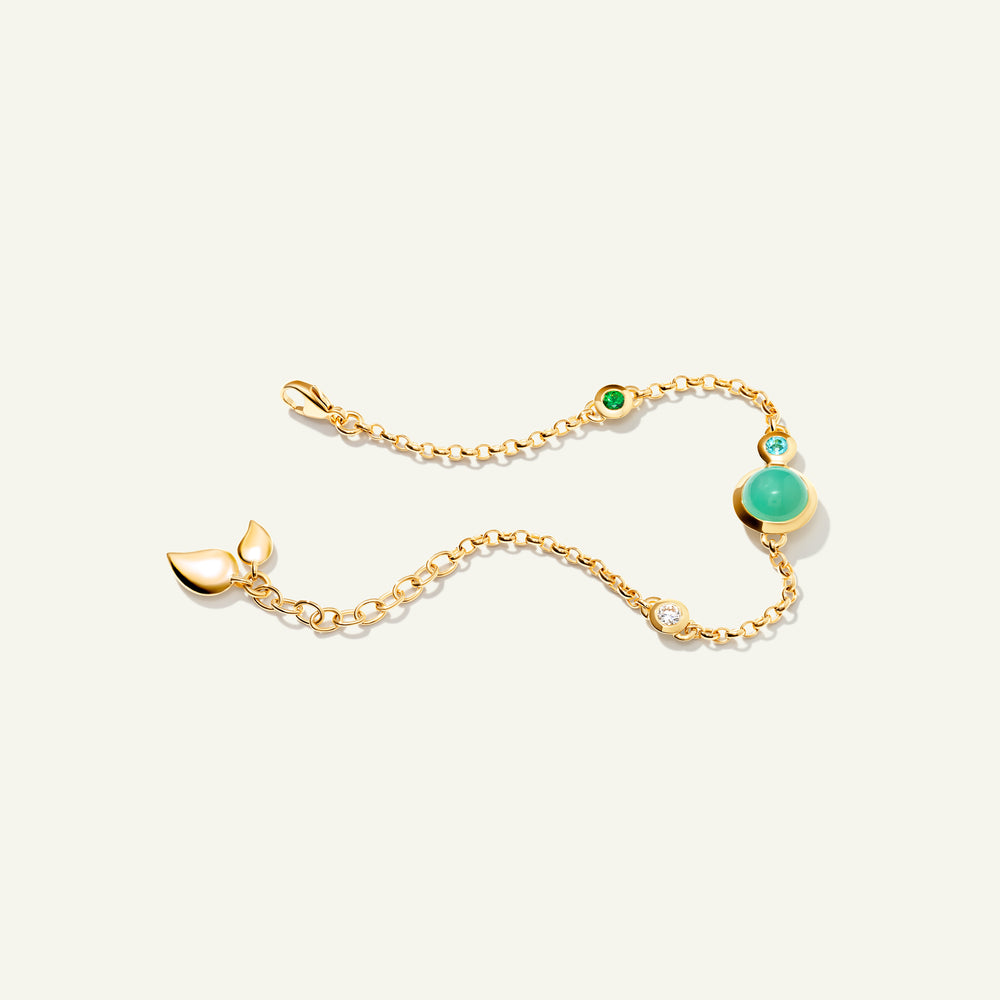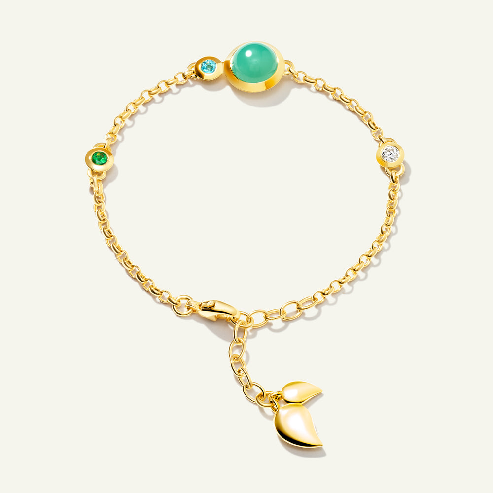 Das BOUTON Mini Chain Armband in 'Lagoon' zelebriert die Schönheit ruhiger Blau- und Grüntöne mit einer verspielten Kombination aus Edelsteinen im Cabochon-Schliff und zarten Wassertropfen-Details in 18 Karat Gold. Ausdrucksstark und zugleich raffiniert passt es an jedes Handgelenk und entfaltet solo getragen ebenso seine Wirkung wie im Layering für ein noch markanteres Statement. Ein vielseitiges Schmuckstück, das jeder Kollektion lebendige Farbe und mühelosen Charme verleiht.