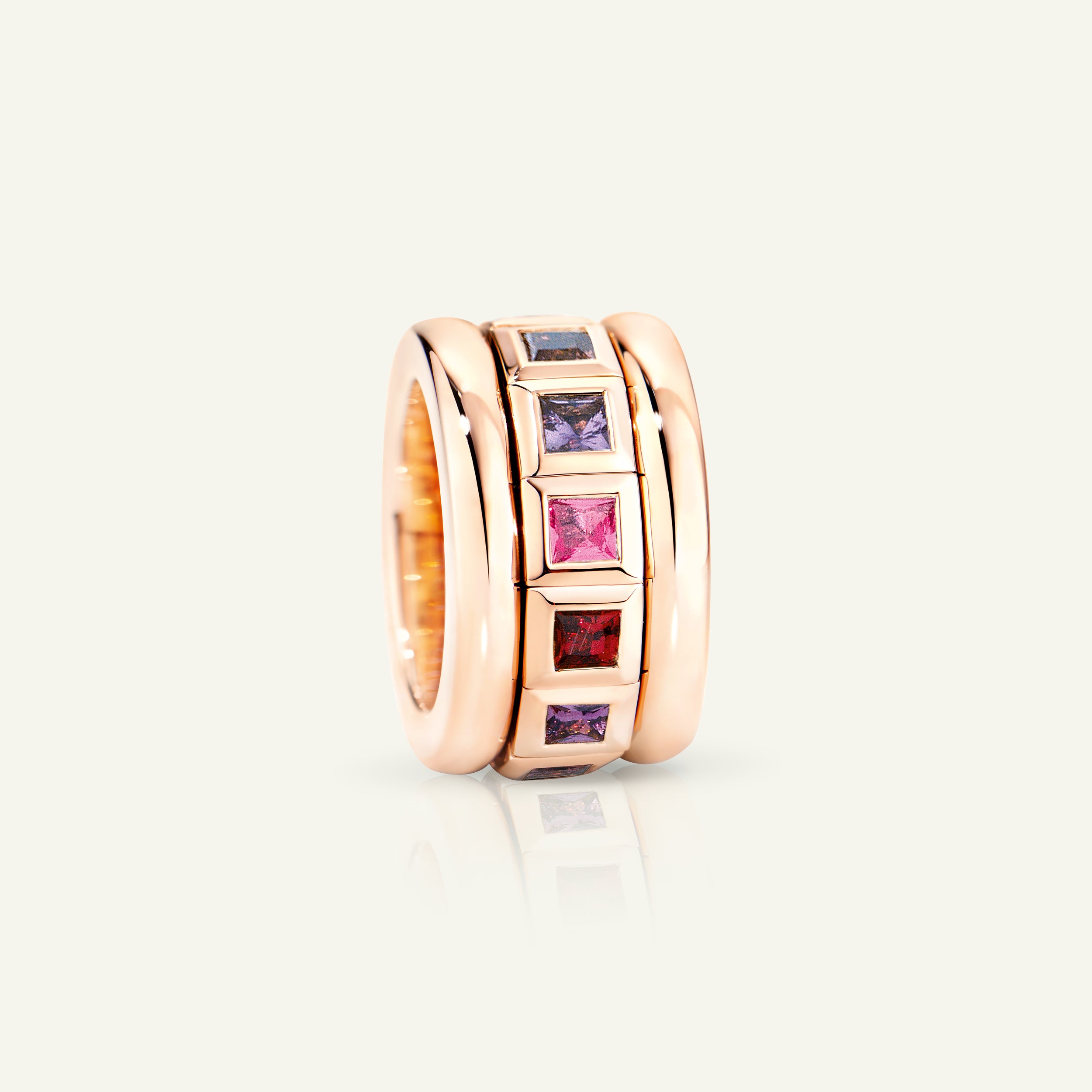 Ein wahrhaft ikonisches Schmuckstück: Der CURRICULUM VITAE Ring ist ein Meisterwerk modernen Designs. Beweglich gefasste Edelsteine im Princess-Cut aus der Color Story 'Wildberry', eingefasst in 18 Karat Gold, sind so arrangiert, dass sie aus jedem Blickwinkel funkeln. Zeitgenössisch und zugleich zeitlos verkörpert dieser außergewöhnliche Ring höchste Handwerkskunst, pure Eleganz und künstlerischen Ausdruck.