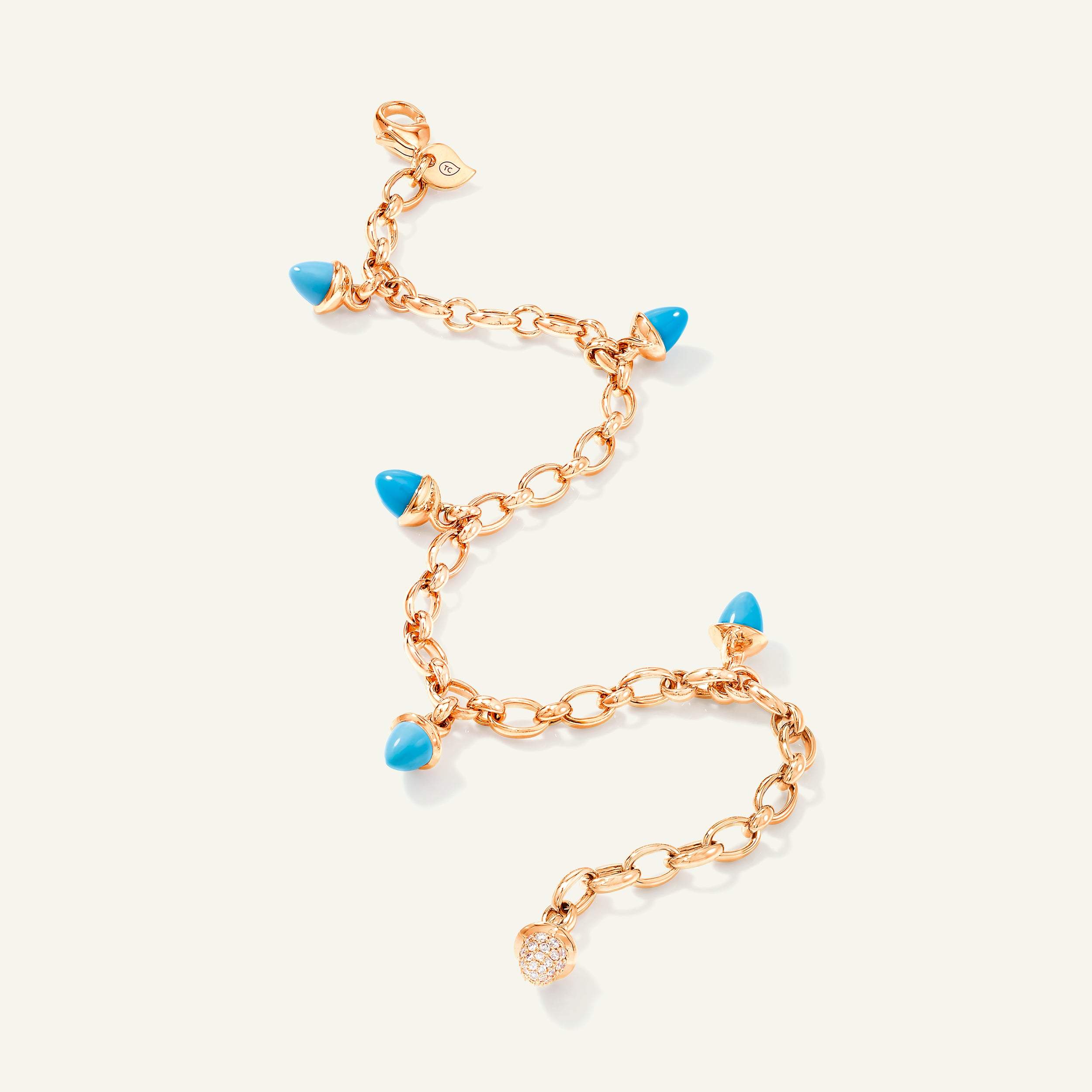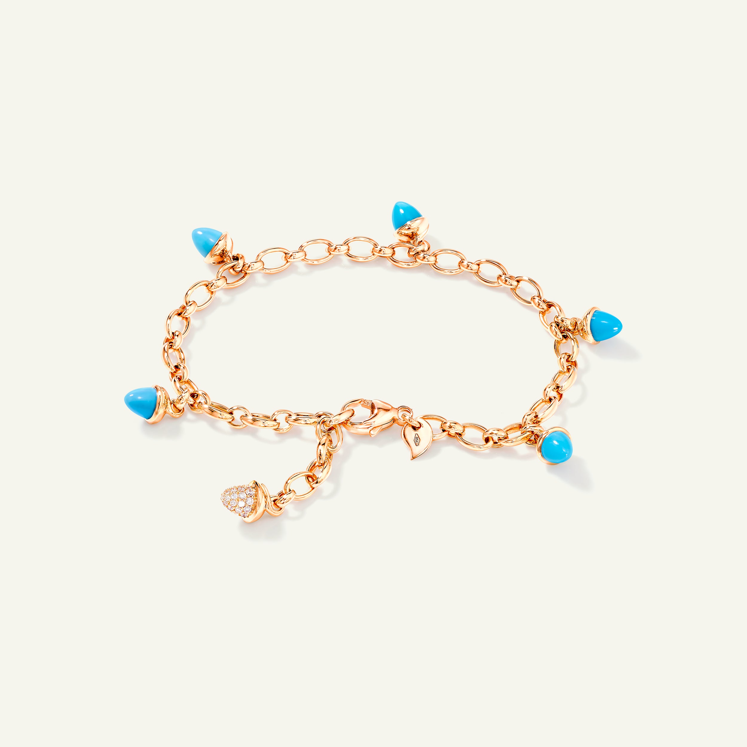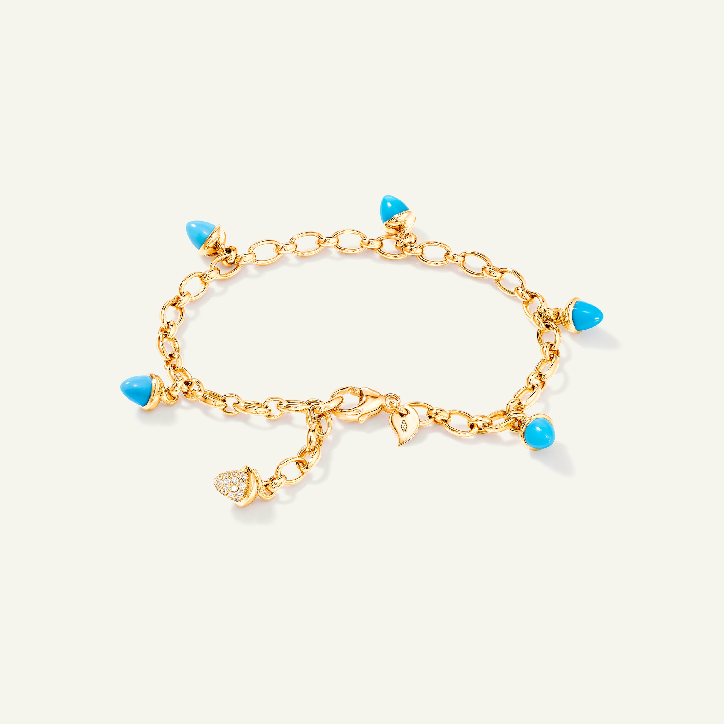 Ein frischer Mix aus Edelsteinen: Das MIKADO Charm Bracelet in 'Turquoise' trägt sechs zarte, kegelförmige blau-grüne Edelsteine an einer handgefertigten 18K-Goldkette. Mit Diamant Pavé für extra Glanz veredelt, begleitet es mühelos vom Tag bis in die Nacht.