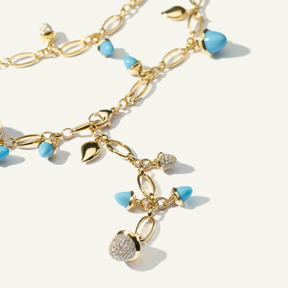 Setzen Sie ein Statement mit der MIKADO Halskette in 'Turqoise', die vielseitige Styling-Möglichkeiten für jeden Anlass bietet. Ein funkelnder Wasserfall aus blau-grünen Edelsteinen erstrahlt an einer handgefertigten Kette aus 18 Karat Gold. Akzente aus Diamant Pavé und zarten Wassertropfen verleihen zusätzlichen Glanz. Lässig am Tag, elegant am Abend.