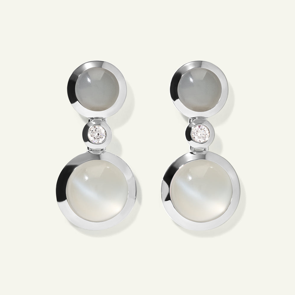 2x großer weißer Mondstein, je ca. 4.4 Karat\r2x kleiner grauer Mondstein, je ca. 1.8 Karat\r2x Diamanten im Brillantschliff (G/si), je ca. 0.14 Karat