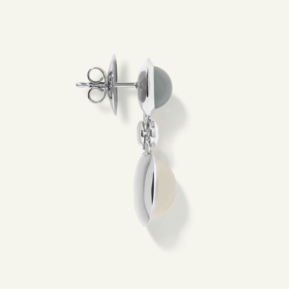 Die BOUTON 2 Cabochons Ohrringe aus 18 Karat Gold präsentieren die sanften Neutraltöne der Color Story 'Cashmere' und kombinieren grauen mit leuchtendem sandfarbenen Mondstein. Verbunden durch einen funkelnden weißen Diamanten schmücken diese ausdrucksstarken Ohrringe das Ohr mit höchster Handwerkskunst und farbenprächtigen Details.