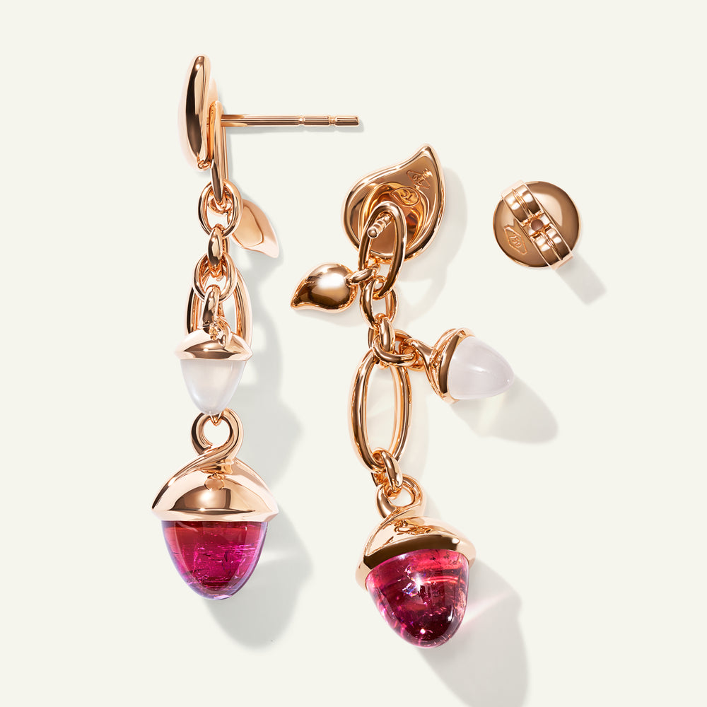 Eine Hommage an die Individualität: Die MIKADO Dangling 2 Acorn Ohrringe lassen sich wahlweise als elegante Hänger, stilvolle Stecker oder als Anhänger an einer Kette tragen. In aufwendiger Handarbeit aus 18 Karat Gold gefertigt, verleihen die charakteristischen Wassertropfen-Details dem Design eine unverwechselbare Signatur. Die feminine Color Story 'Blush' vereint rosafarbene Edelsteine mit zarten weißen Mondsteinen und kreiert so einen Look, der zugleich romantisch und mühelos chic ist.