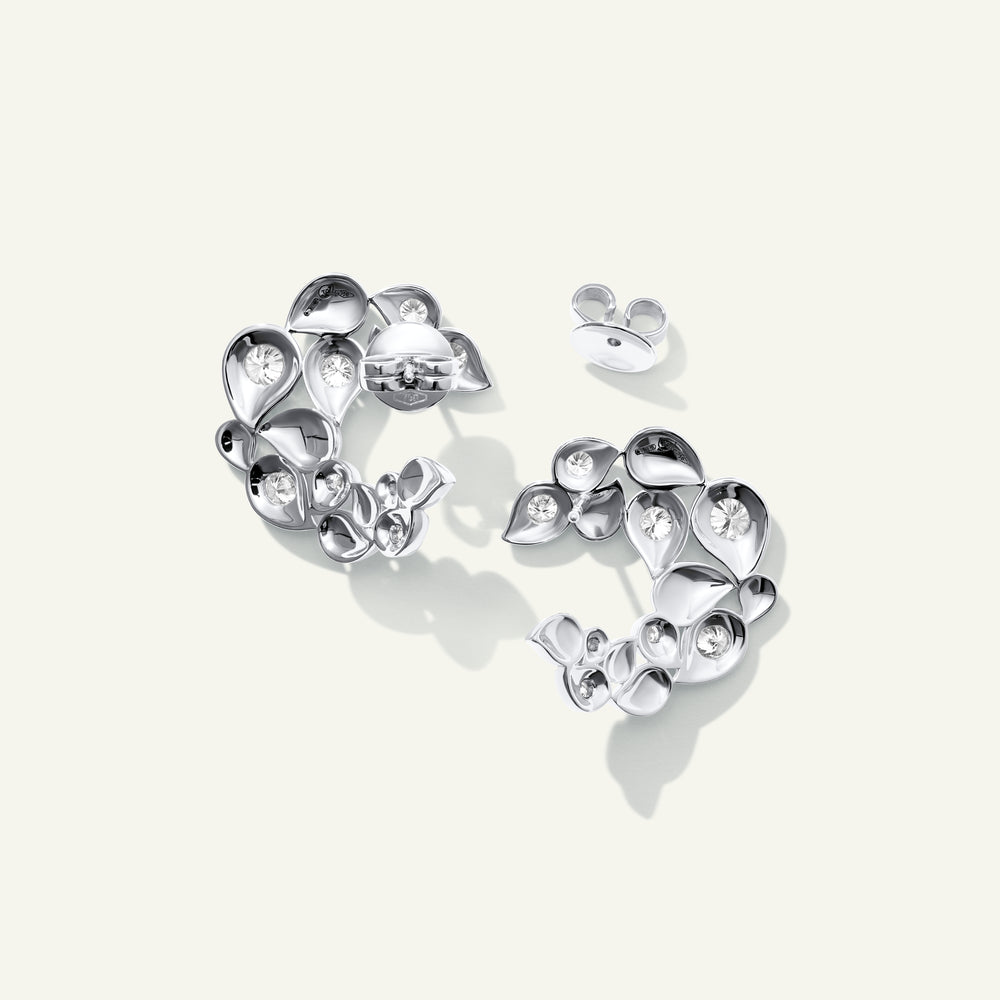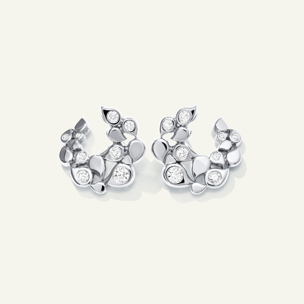Ganz im romantischen Geist der SNOWFLAKES Kollektion präsentieren diese kunstvollen Ohrringe das ikonische Wassertropfen-Motiv in einer Abfolge aus poliertem 18 Karat Gold und funkelnden weißen Diamanten. Mit ihrer gedrehten Creolen-Silhouette schmiegen sie sich sanft hinter das Ohrläppchen und formen einen eleganten Kreis