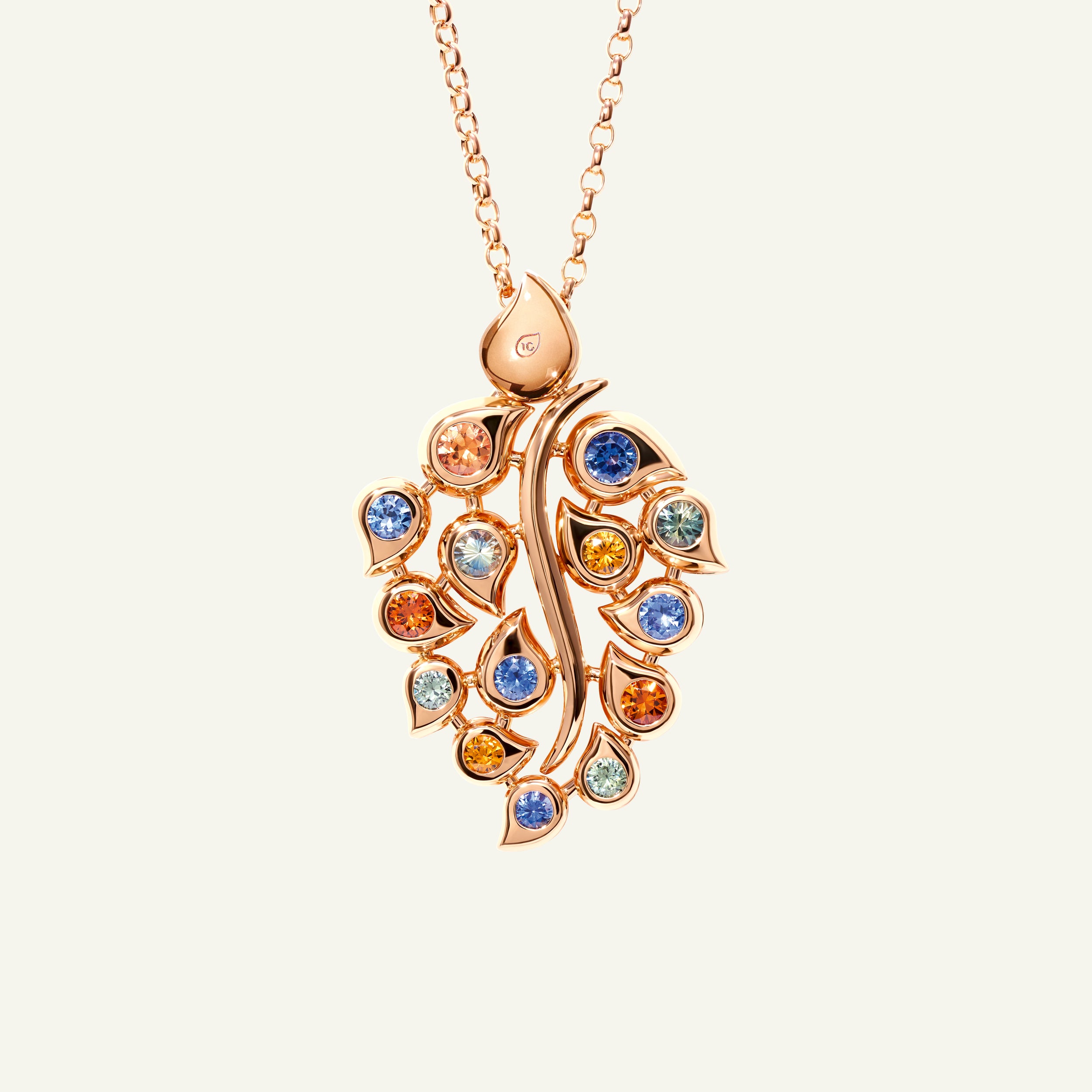 2.10 Karat Diamanten im Brillantschliff (F/vs) auf einer Seite 2.7 Karat blaue, orangene und grüne Saphire auf der anderen Seite