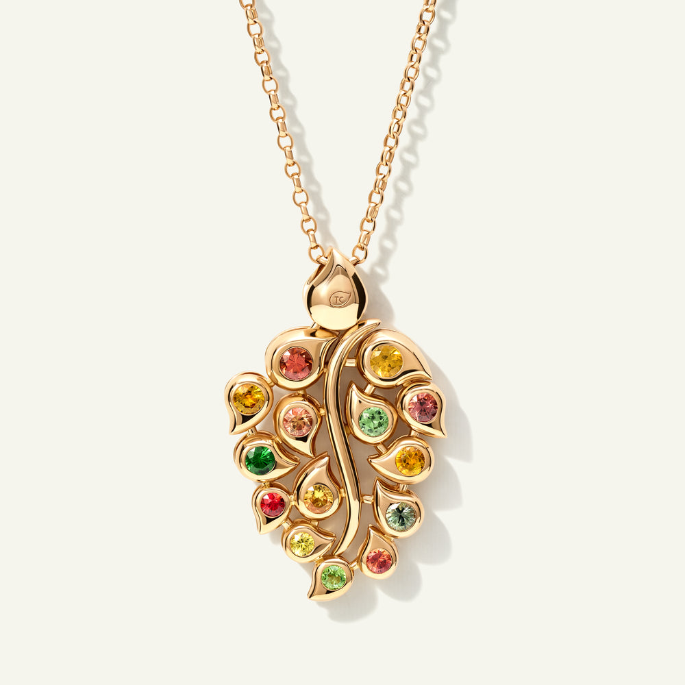 Der SNOWFLAKES Leaf Anhänger in 'Indian Summer' erstrahlt auf der einen Seite mit goldgelben, feurigen orangen und tiefroten Edelsteinen und auf der anderen mit funkelnden weißen Diamanten, jeweils gefasst in 18 Karat Gold. Getragen an einer langen Kette oder einem lässigen Lederband, ist dieser Anhänger vielseitig einsetzbar – eine elegante Wahl für alltäglichen Luxus ebenso wie für besondere Anlässe.