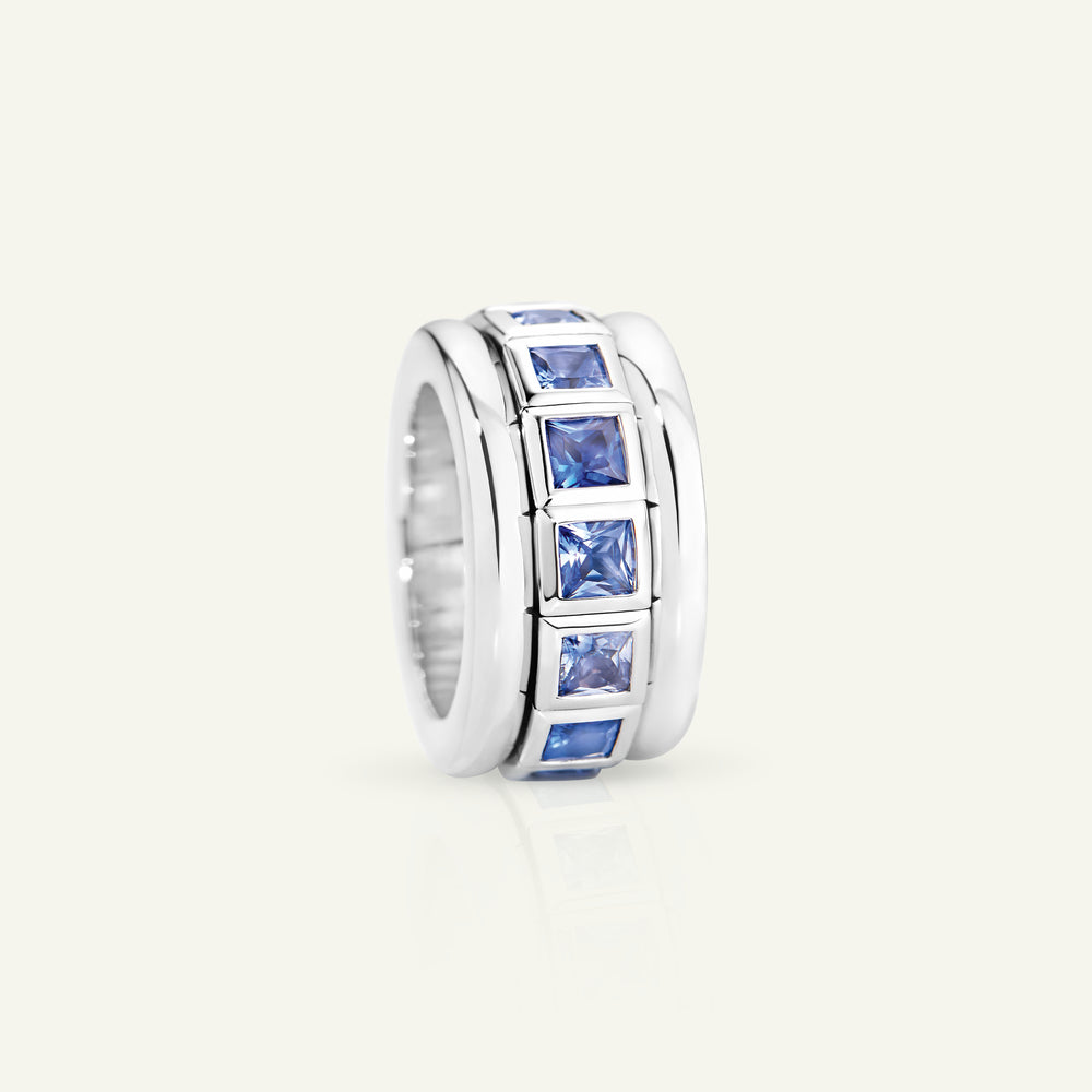 Ein wahrhaft ikonisches Schmuckstück: Der CURRICULUM VITAE Ring ist ein Meisterwerk modernen Designs. Beweglich gefasste Edelsteine im Princess-Cut aus der Color Story 'Sky', eingefasst in 18 Karat Gold, sind so arrangiert, dass sie aus jedem Blickwinkel funkeln. Zeitgenössisch und zugleich zeitlos verkörpert dieser außergewöhnliche Ring höchste Handwerkskunst, pure Eleganz und künstlerischen Ausdruck.