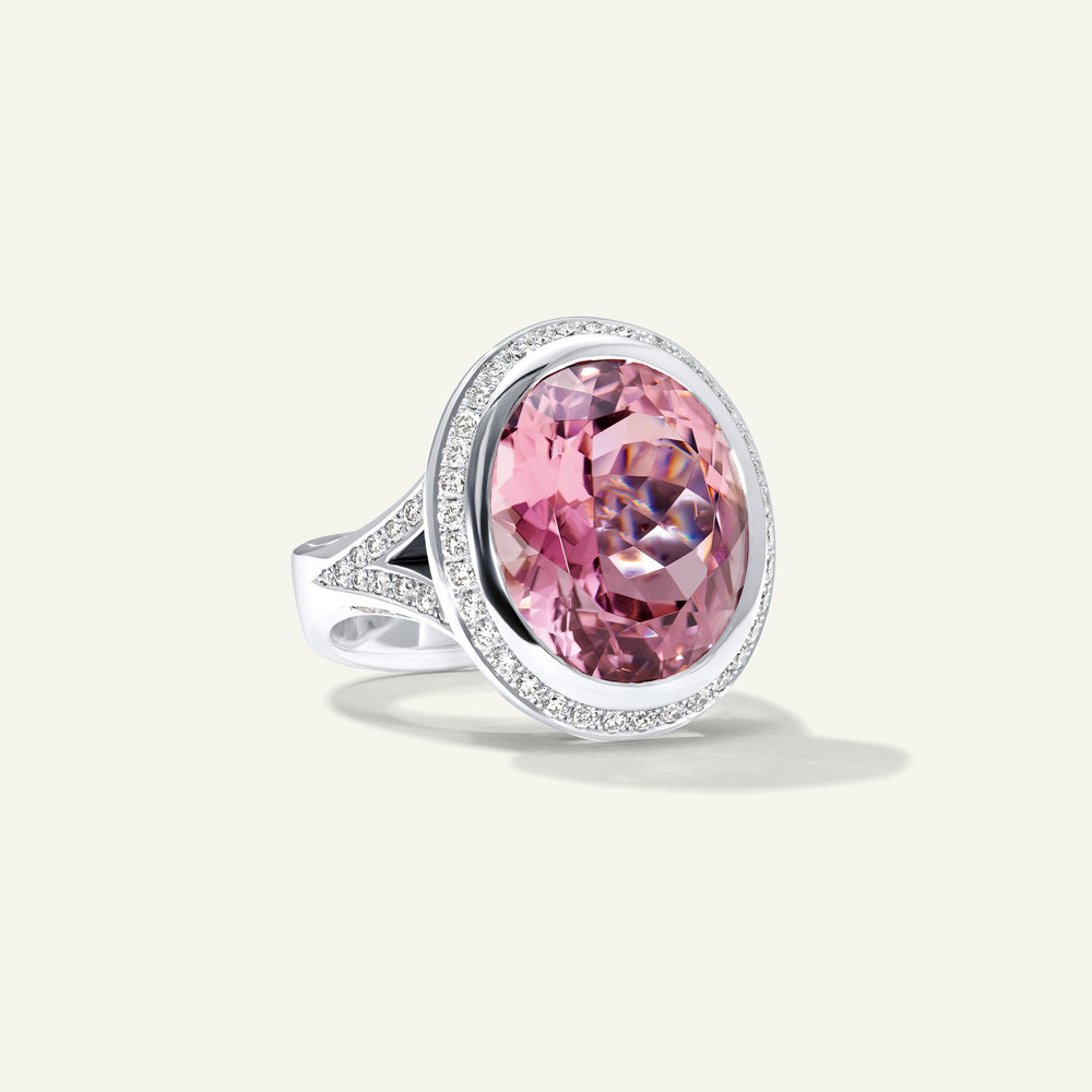 Mit einem 14,75 ct rosa Turmalin im Ovalschliff sowie ca. 1,05 ct Brillanten in feiner Qualität (F/vs).