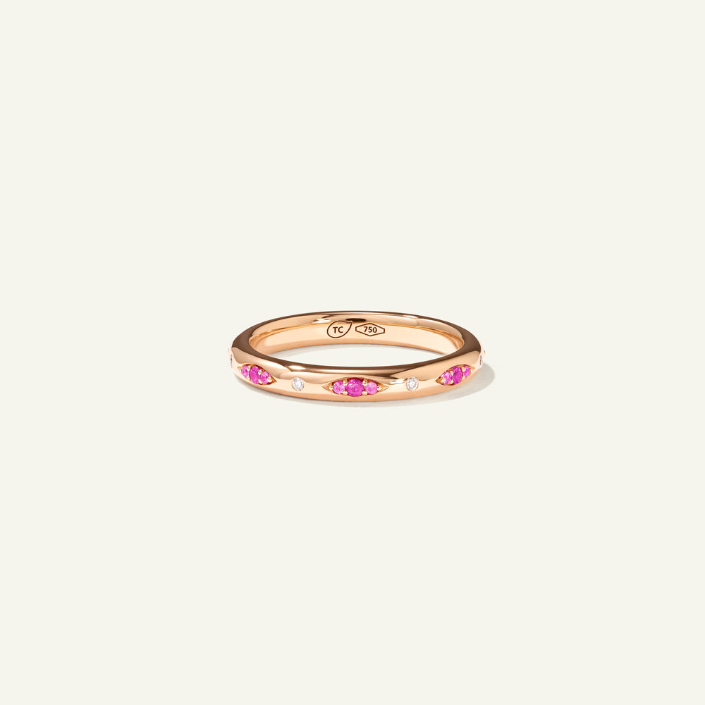 Der GYPSY Band Ring in der Color Story 'Blush' verleiht zeitlosem Design einen modernen Twist. Gefertigt aus 18 Karat Gold, schimmert er mit einem zarten Pavé aus pinkfarbenen Saphiren und funkelnden weißen Diamanten im Brillantschliff. Dieser vielseitige Ring eignet sich perfekt zum Stapeln, Kombinieren und Mix & Match – für Looks, die von klassischer Eleganz bis zu lässigem Boho-Charme reichen.
