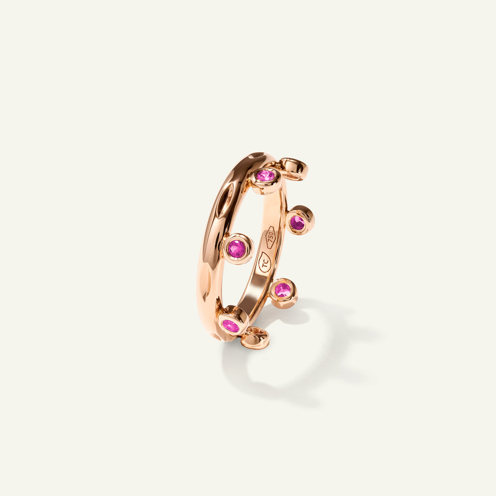 Der GYPSY Crown Ring in der Color Story 'Blush' verleiht der Kollektion eine strahlend neue Facette. Gefertigt aus 18 Karat Gold, zeigt er pinkfarbene Saphire im Brillantschliff, die entlang der kronenförmigen Ringschiene gefasst sind. Mit Edelsteinen, die auch an den Seiten positioniert sind, bietet dieses Design eine markante Silhouette und unendliche Styling-Möglichkeiten.