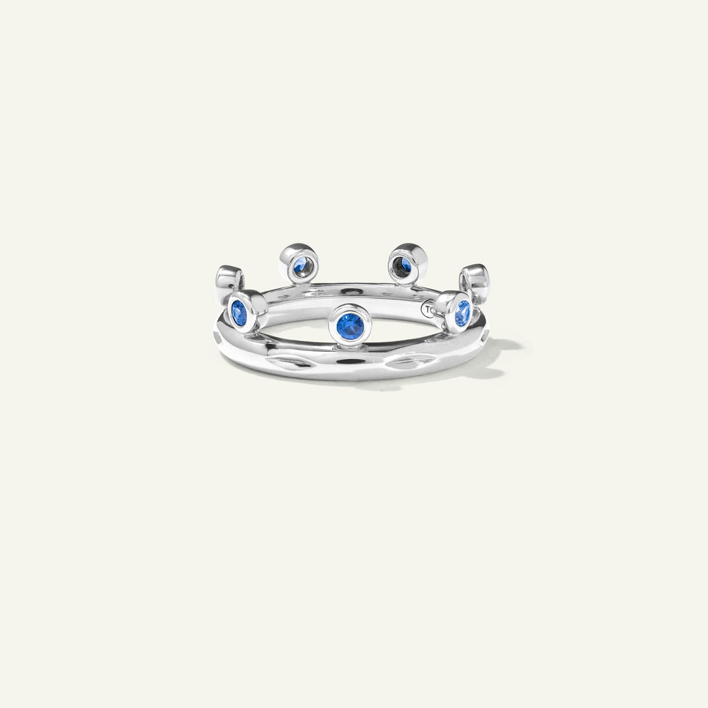 Der GYPSY Crown Ring in der Color Story 'Ocean' fängt den erfrischenden Geist des Meeres ein. Gefertigt aus 18 Karat Gold, erstrahlt er mit blauen Saphiren im Brillantschliff, die entlang der kronenförmigen Ringschiene gefasst sind. Mit Edelsteinen, die auch an den Seiten eingefasst sind, bietet dieses Design eine markante Silhouette und vielseitige Styling-Möglichkeiten.