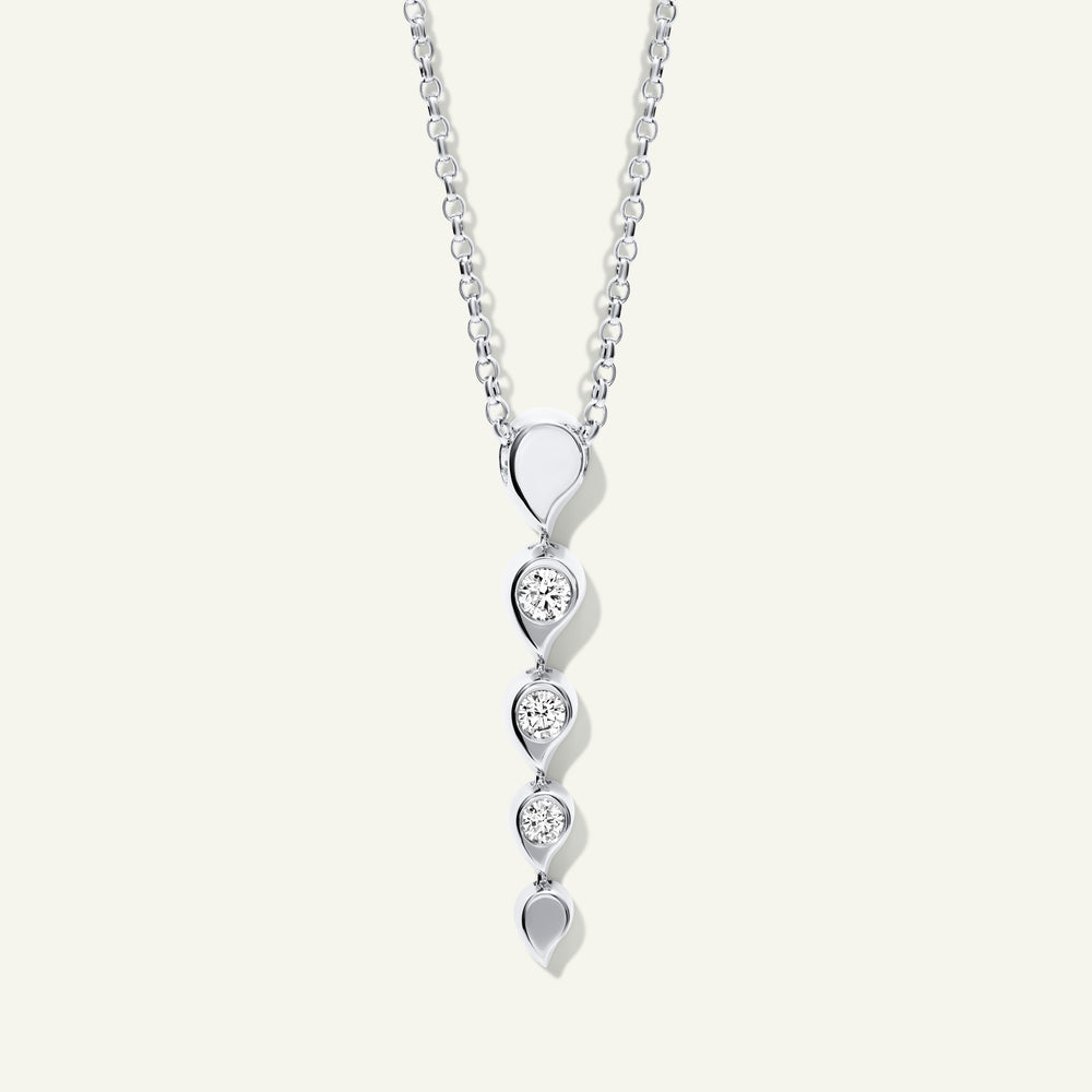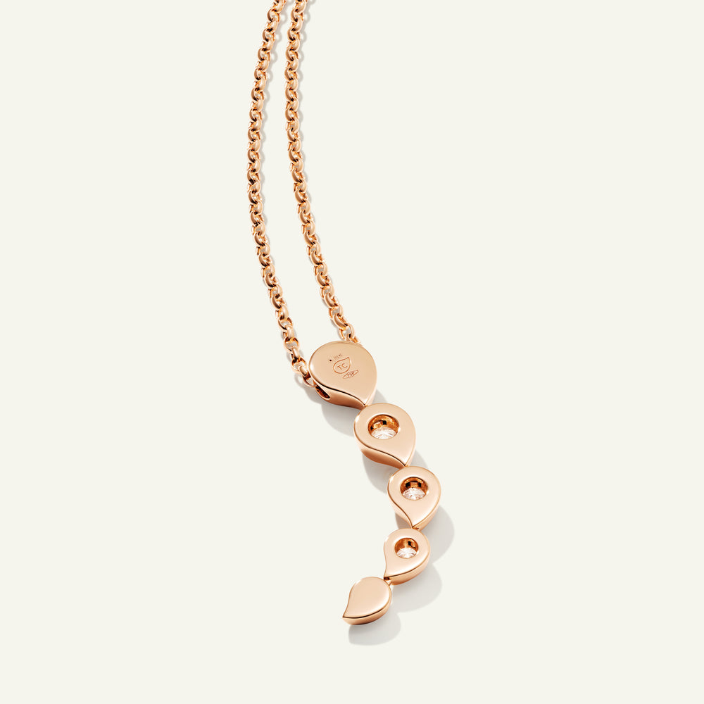 Ganz im romantischen Geist der SNOWFLAKES Kollektion präsentiert der Rivière Anhänger ikonische Wassertropfen-Formen aus poliertem 18 Karat Gold, jeweils besetzt mit funkelnden weißen Diamanten. Durch die sanfte Beweglichkeit zwischen den Fassungen entsteht die Anmutung fließenden Wassers, während das Licht eingefangen wird – ein beeindruckendes Schmuckstück, in dem moderne Handwerkskunst auf zeitlose Raffinesse trifft.
